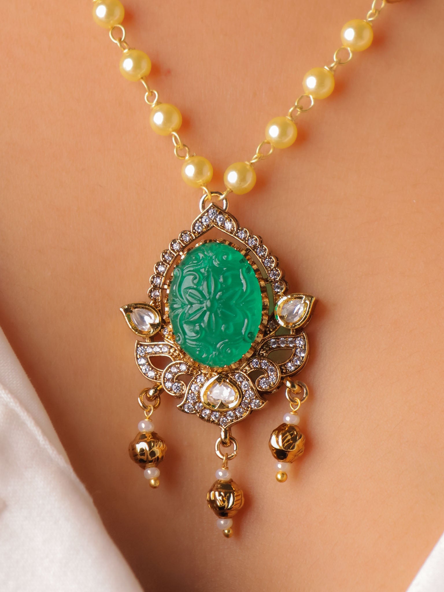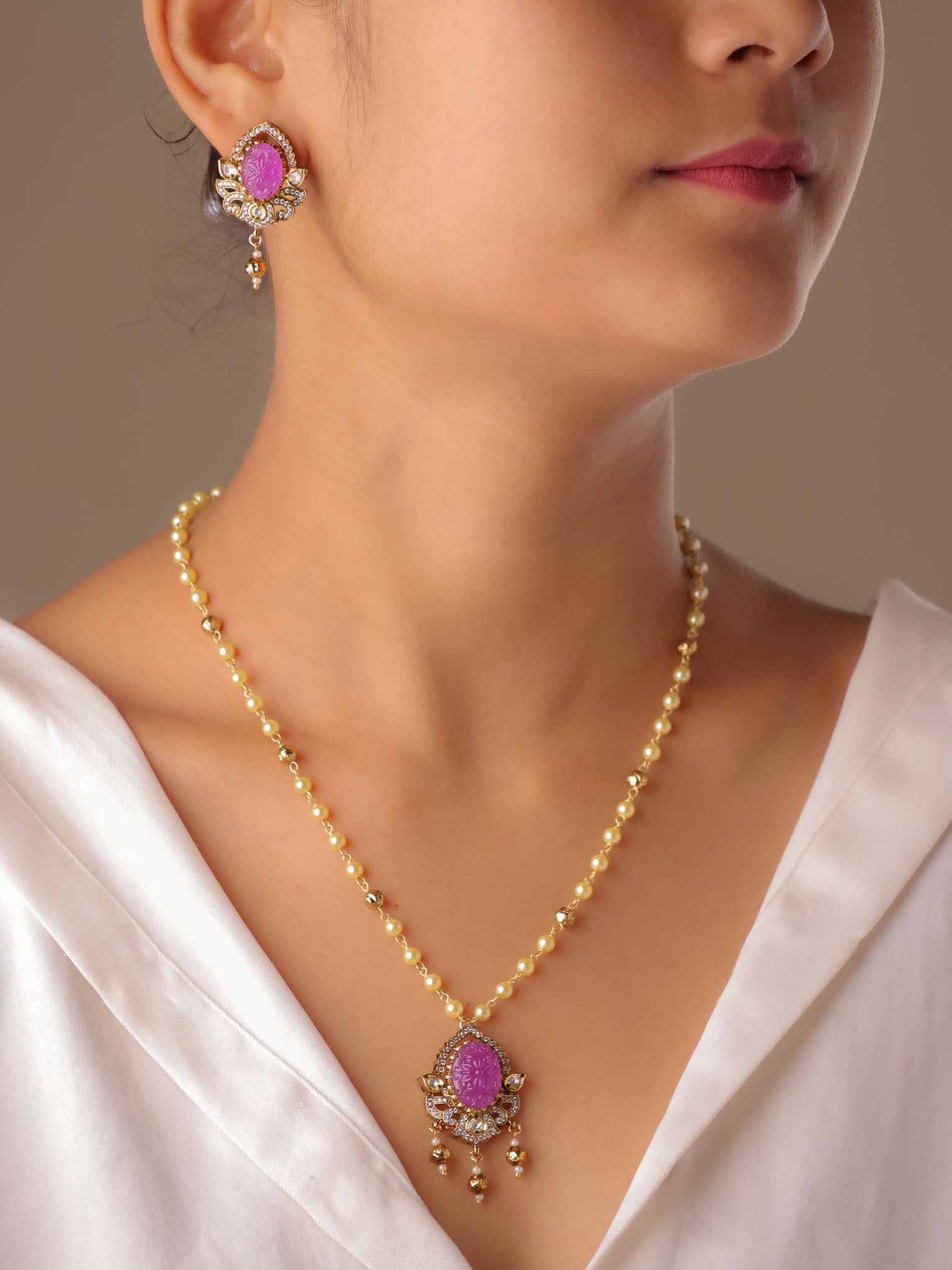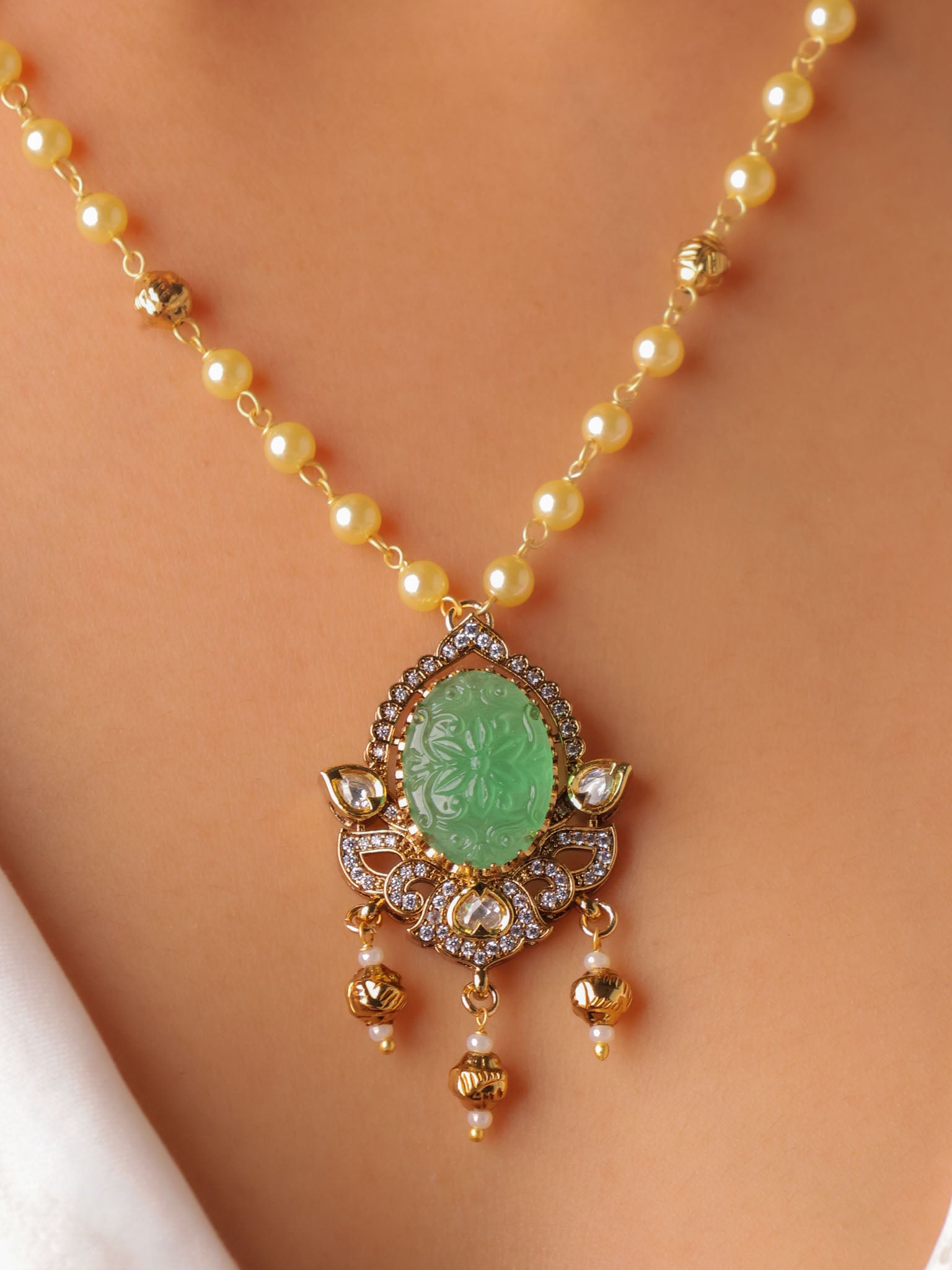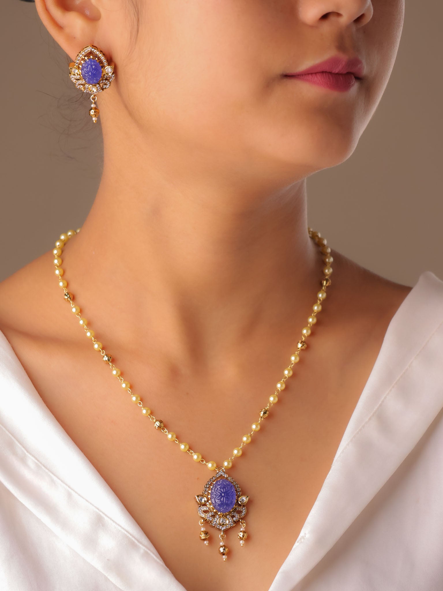 Set in a classic kundan-style frame, the oval carved stones are surrounded by fine crystal accents and finished with subtle gold-toned danglers that lend graceful movement. The pendant is paired with a sleek gold-beaded chain, while the matching earrings echo the same carved stone artistry for a balanced, elegant look.