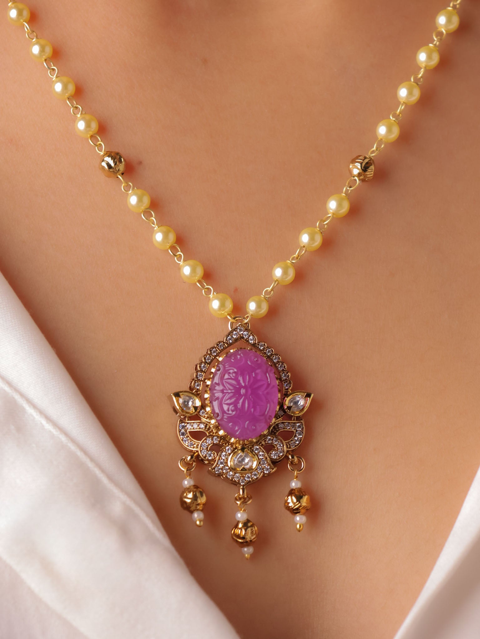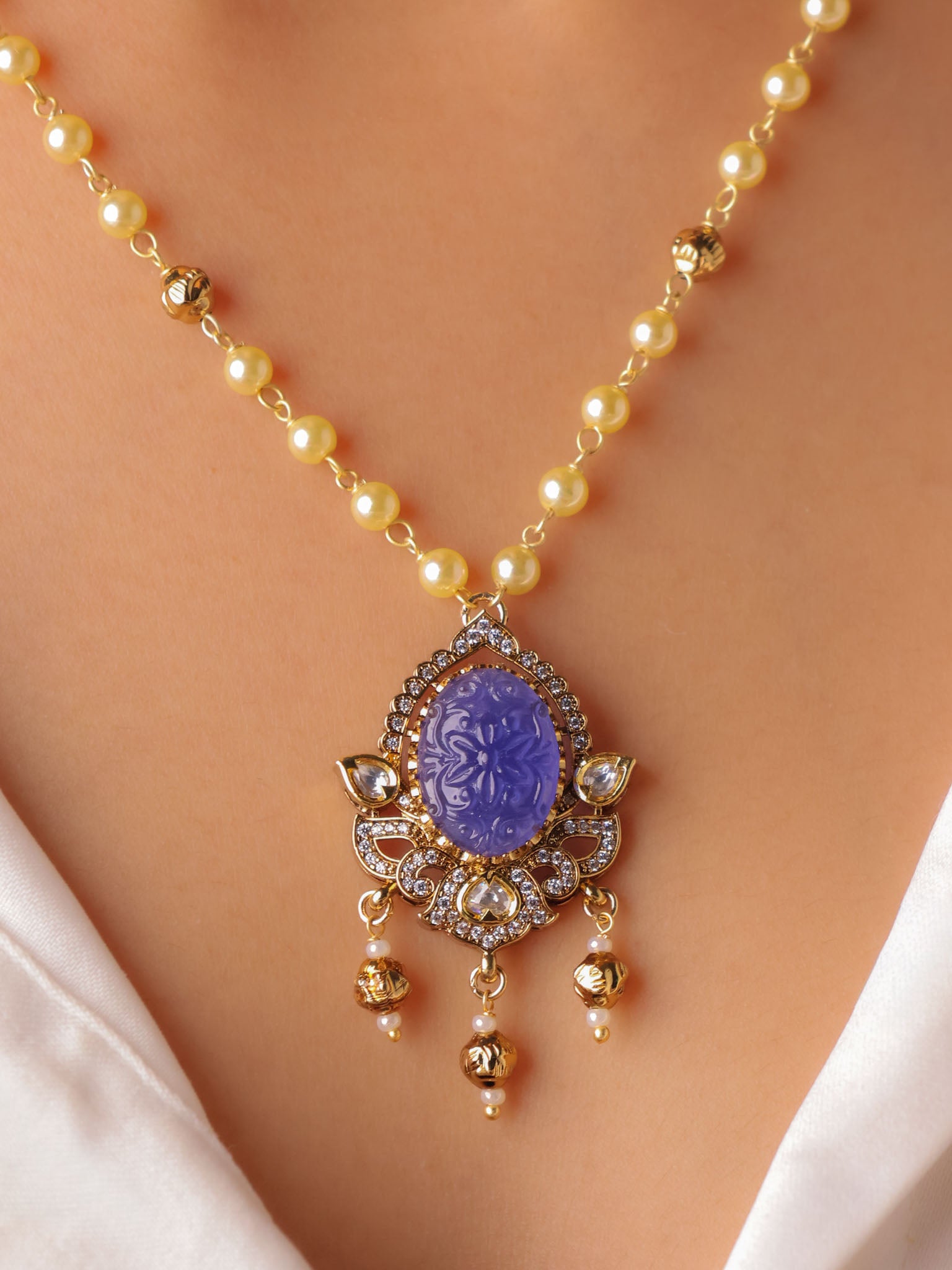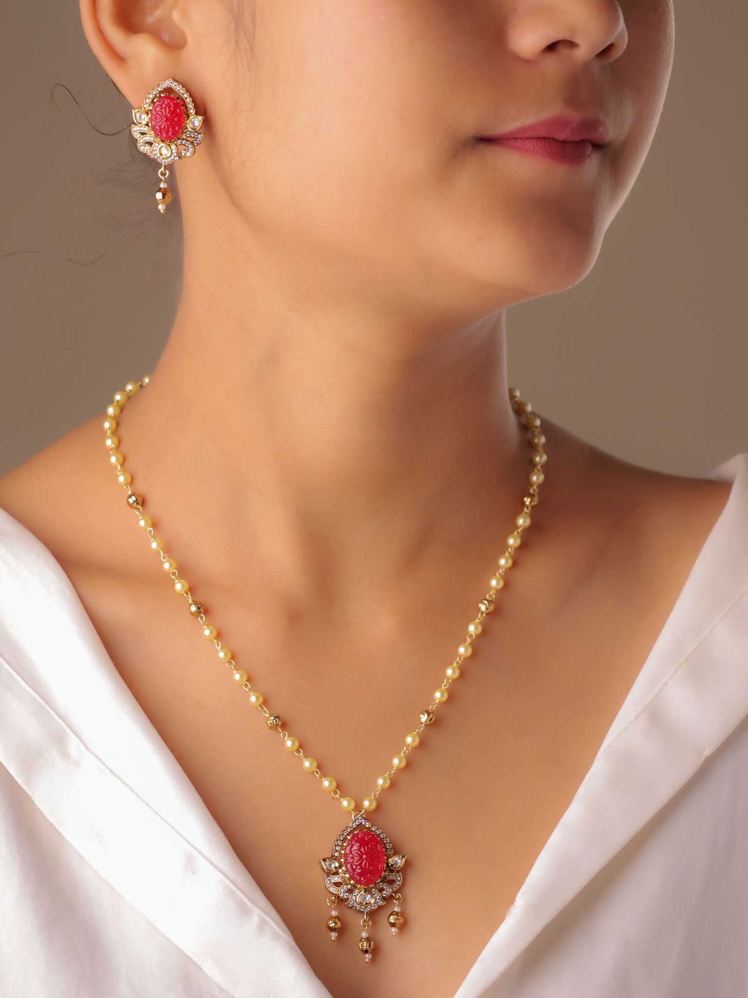 Set in a classic kundan-style frame, the oval carved stones are surrounded by fine crystal accents and finished with subtle gold-toned danglers that lend graceful movement. The pendant is paired with a sleek gold-beaded chain, while the matching earrings echo the same carved stone artistry for a balanced, elegant look.