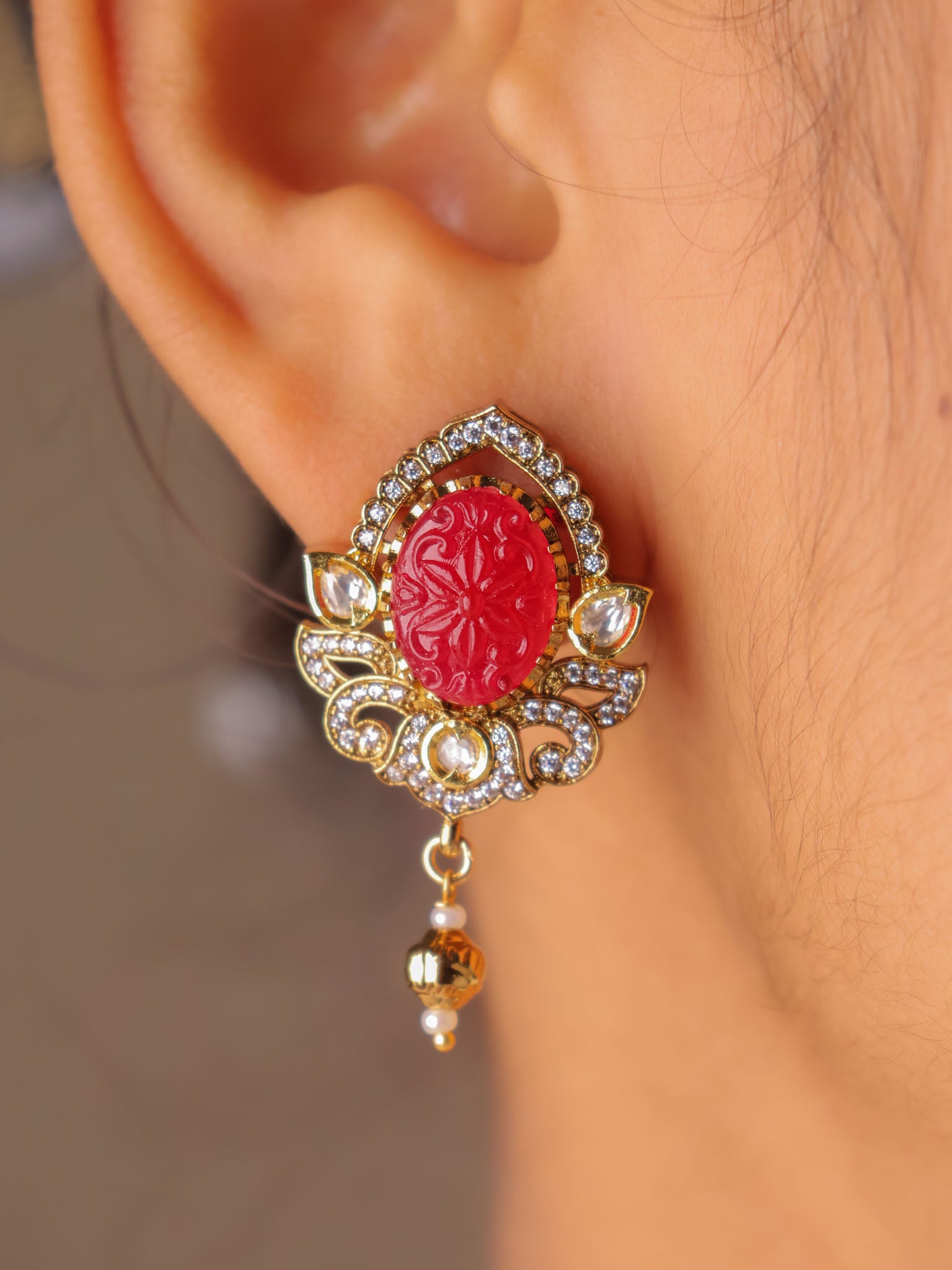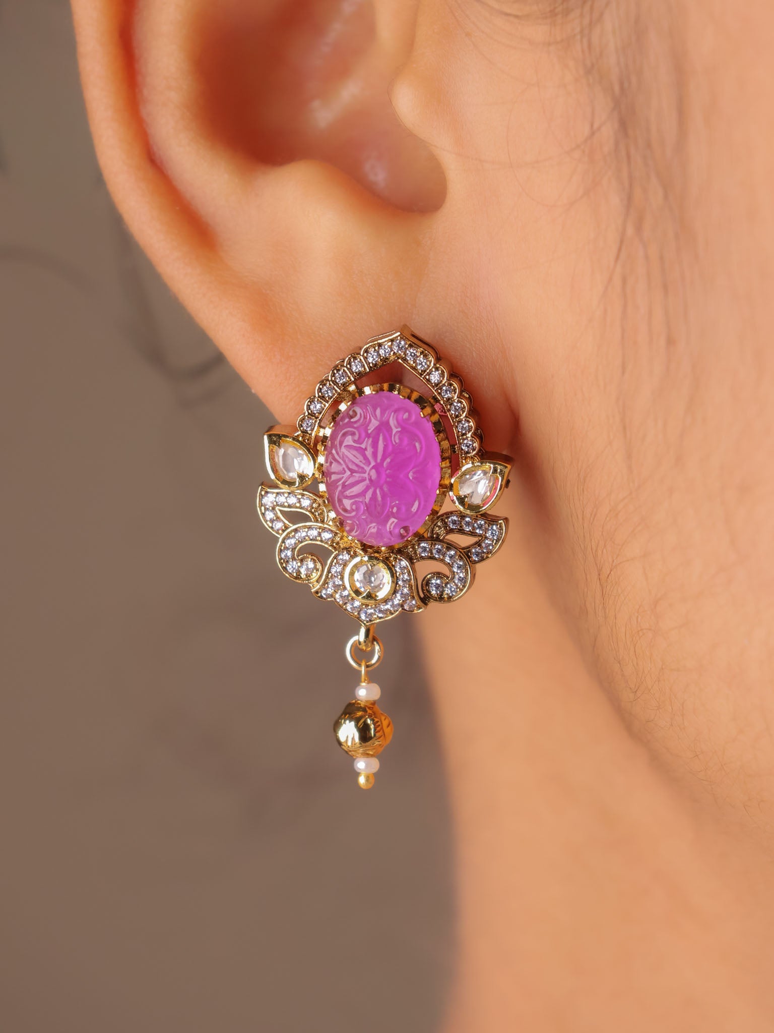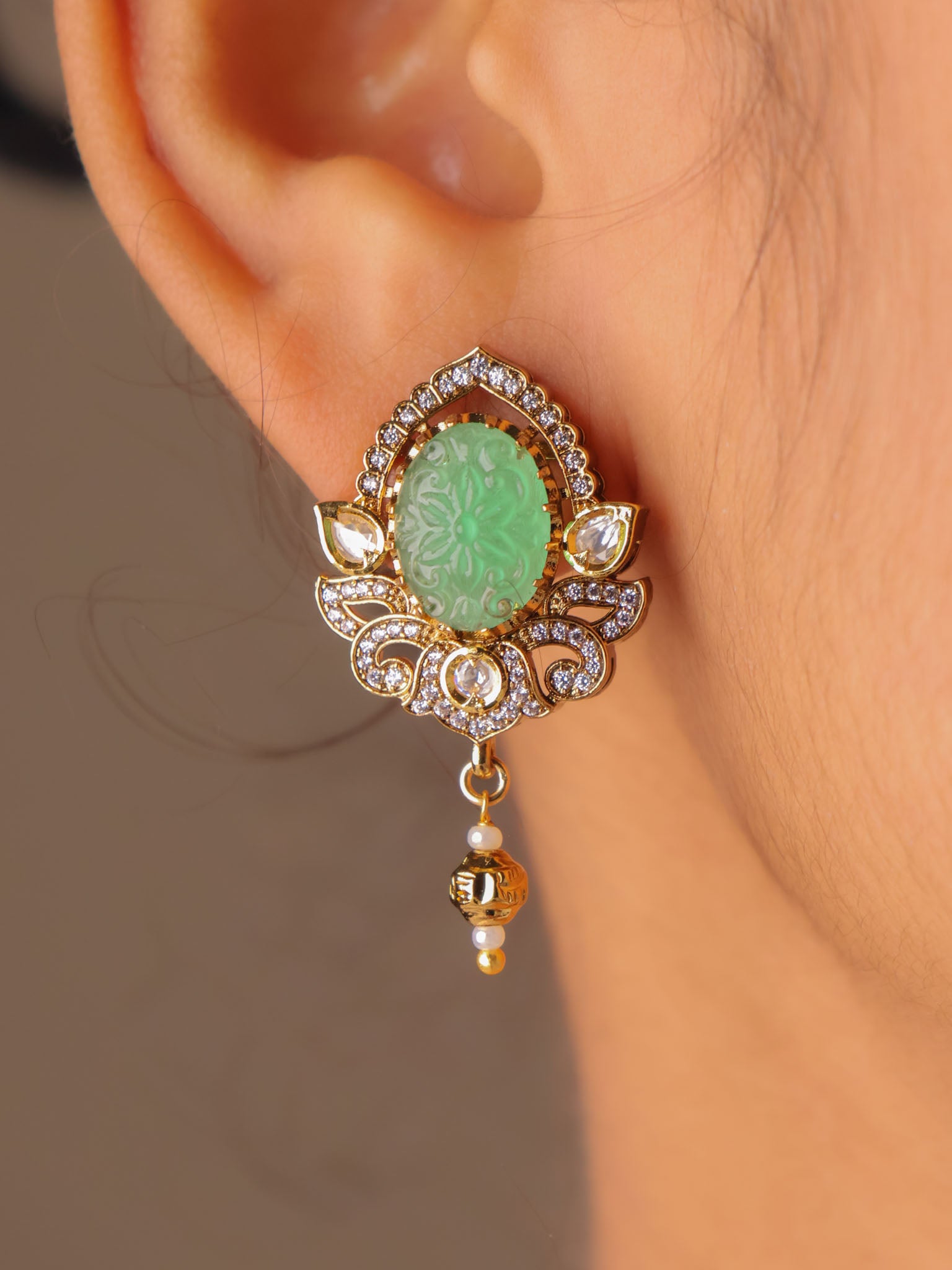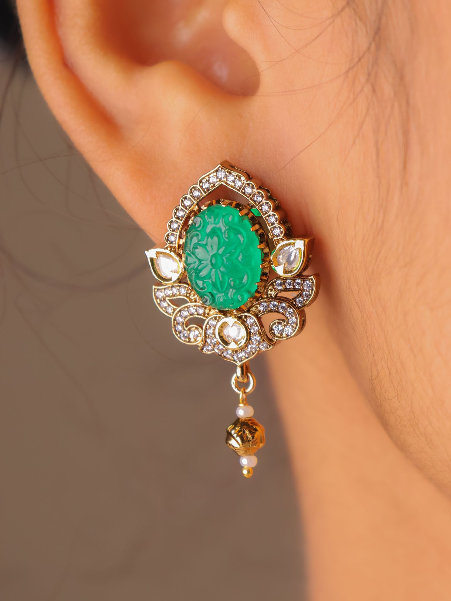 Set in a classic kundan-style frame, the oval carved stones are surrounded by fine crystal accents and finished with subtle gold-toned danglers that lend graceful movement. The pendant is paired with a sleek gold-beaded chain, while the matching earrings echo the same carved stone artistry for a balanced, elegant look.