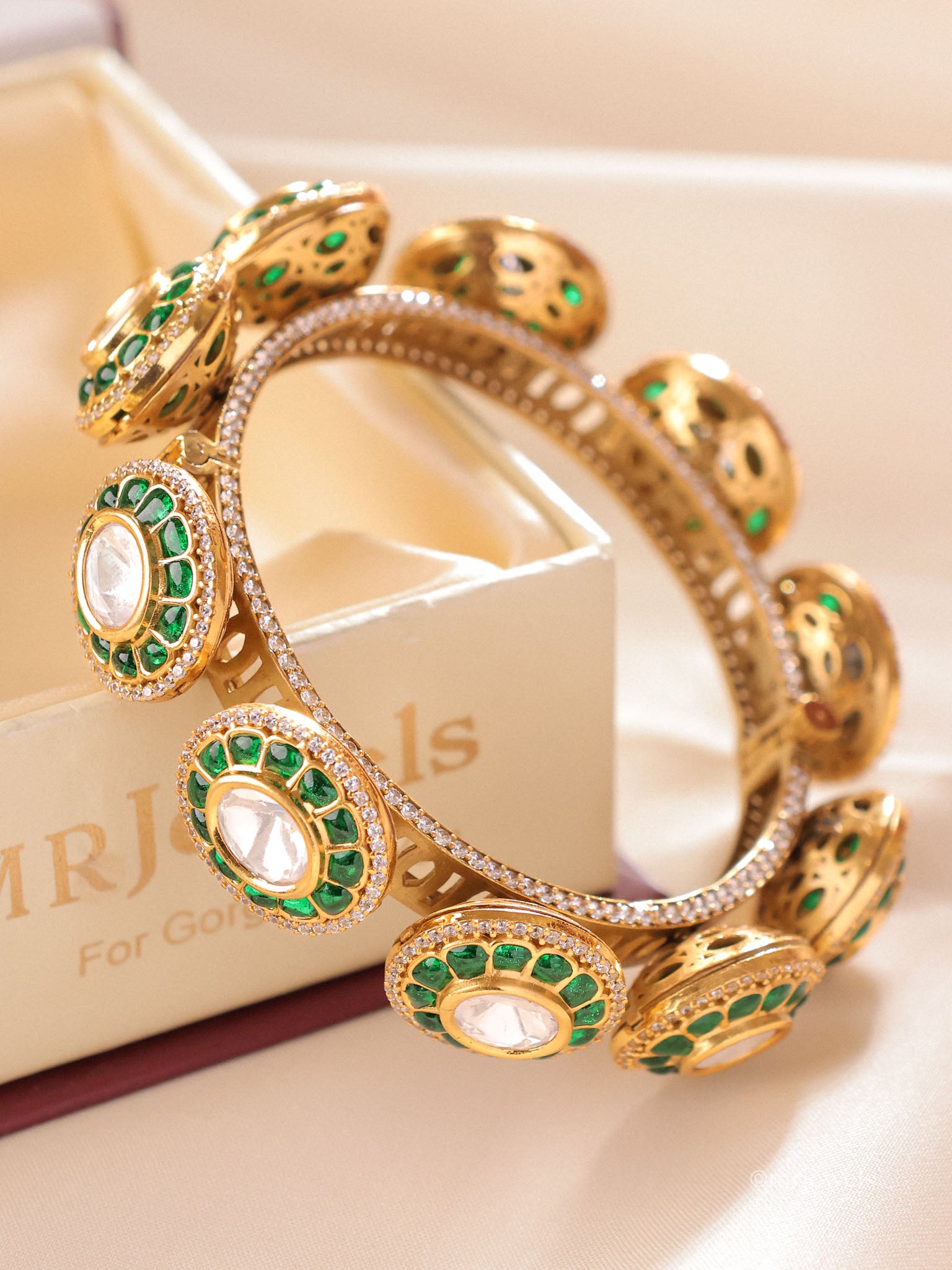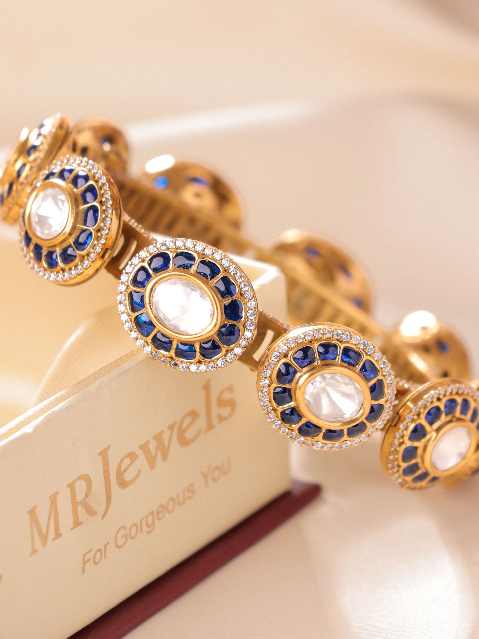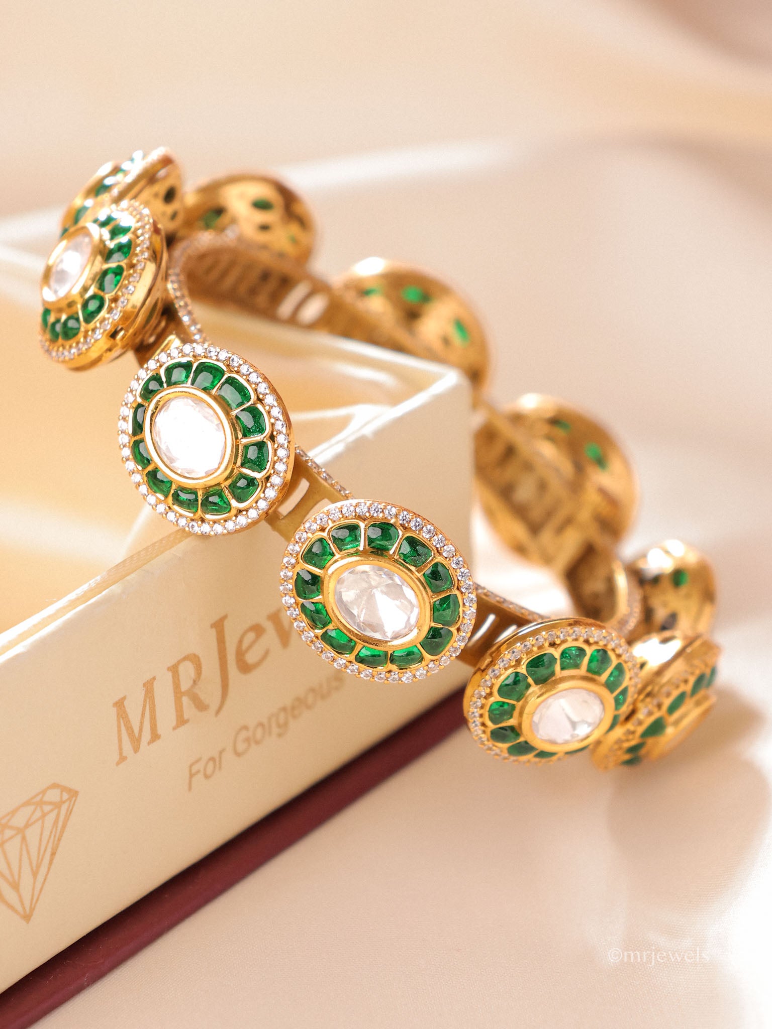 The Aafreen Polki Kada Openable features a timeless round motif design adorned with polki-style stones and delicate crystal accents. Crafted in an antique gold finish, this elegant kada blends traditional charm with a modern, versatile appeal.