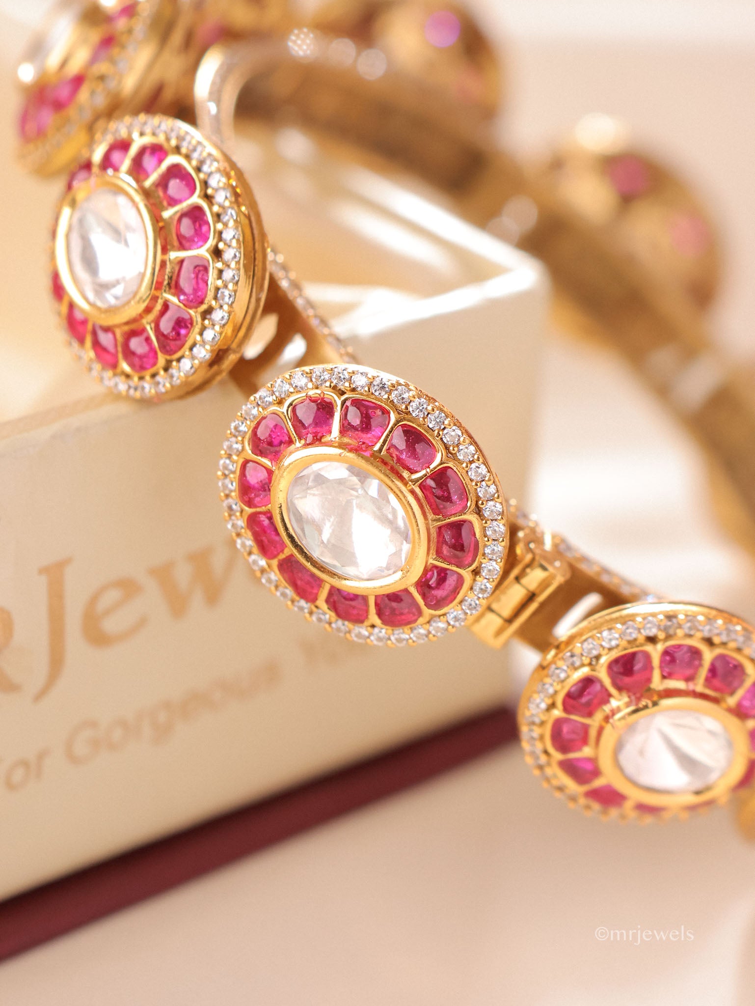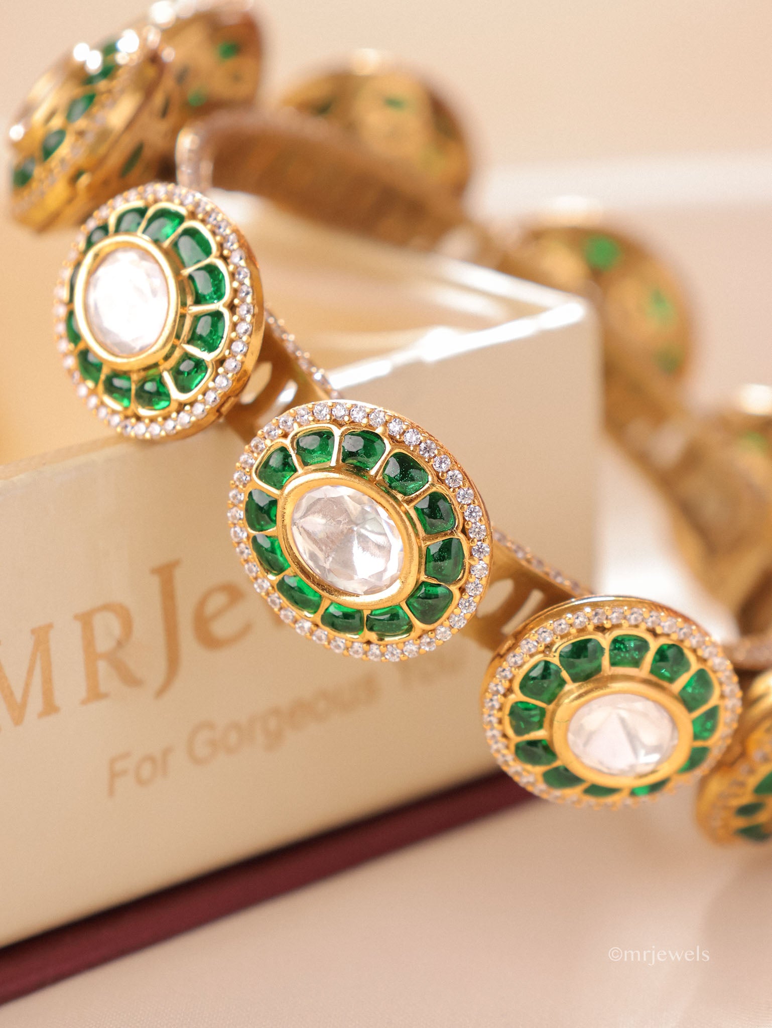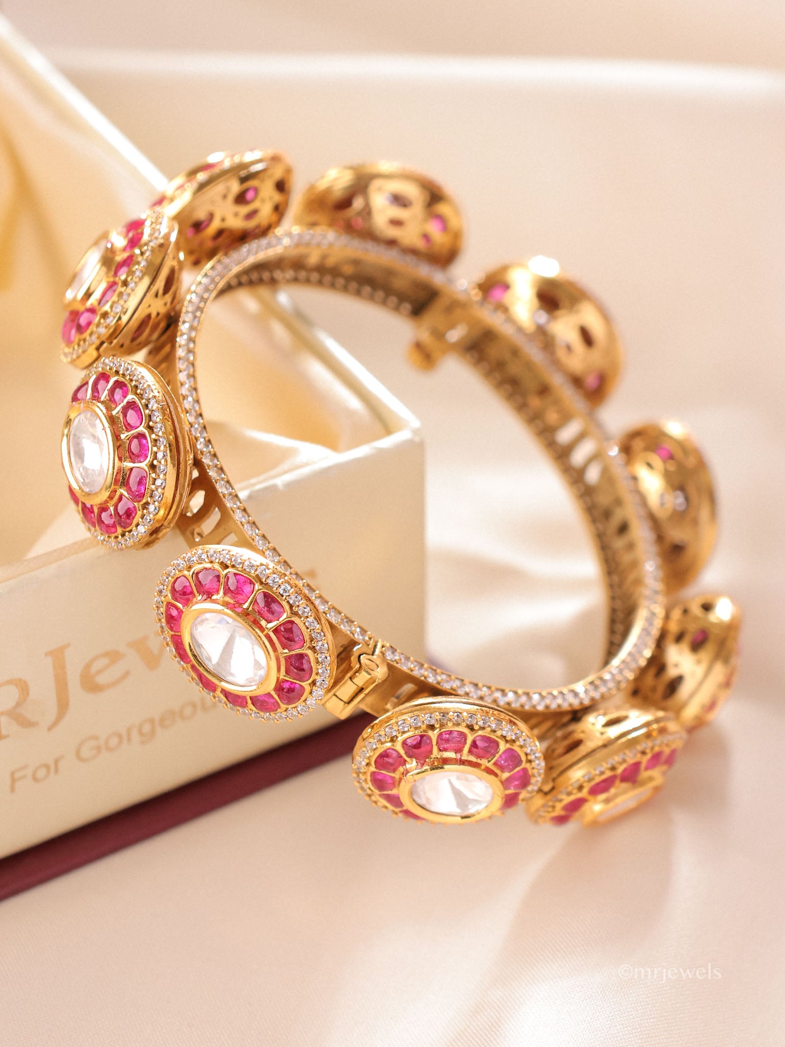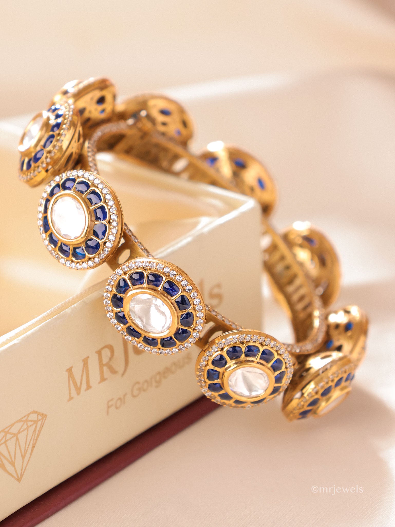 The Aafreen Polki Kada Openable features a timeless round motif design adorned with polki-style stones and delicate crystal accents. Crafted in an antique gold finish, this elegant kada blends traditional charm with a modern, versatile appeal.
