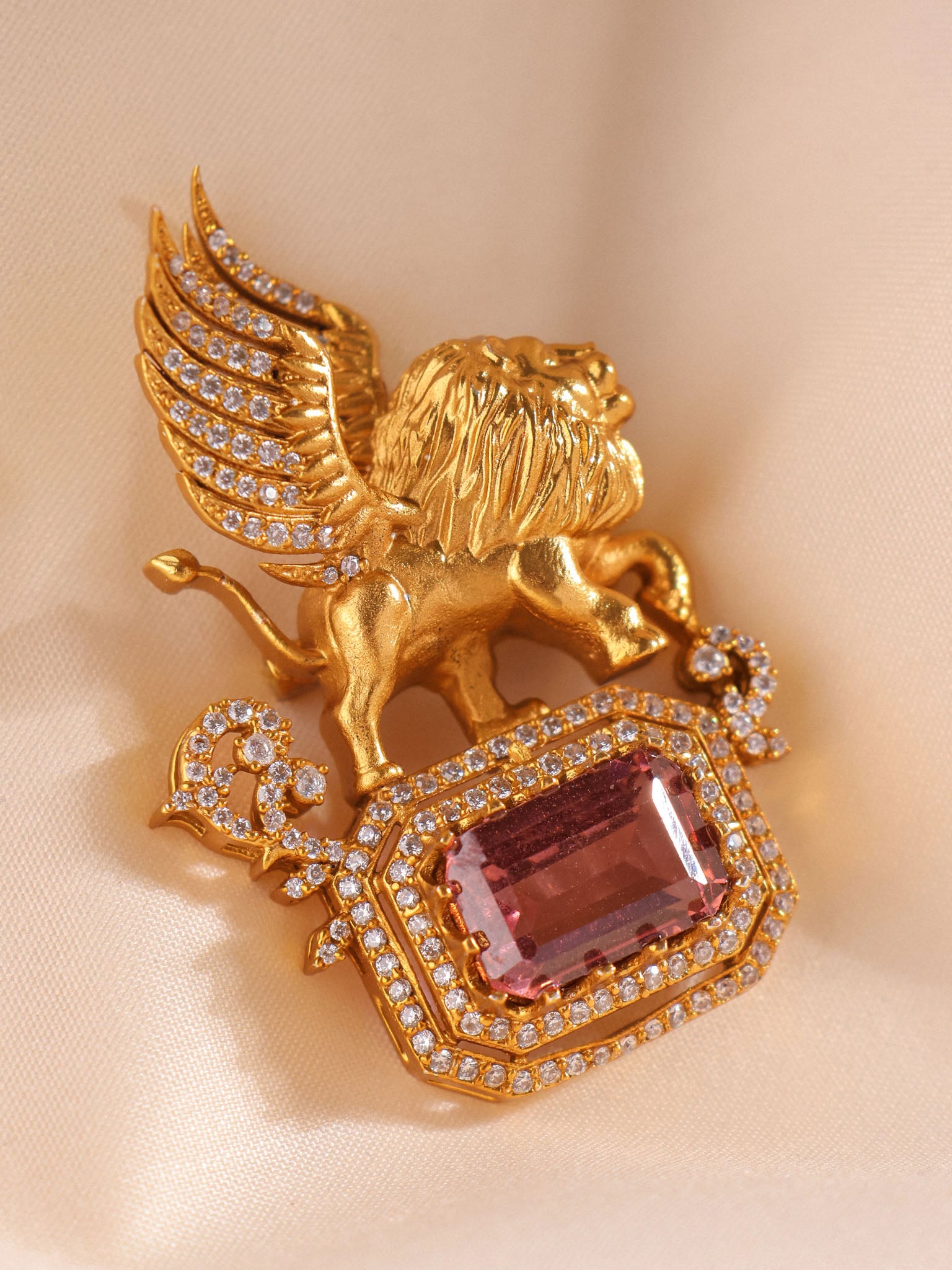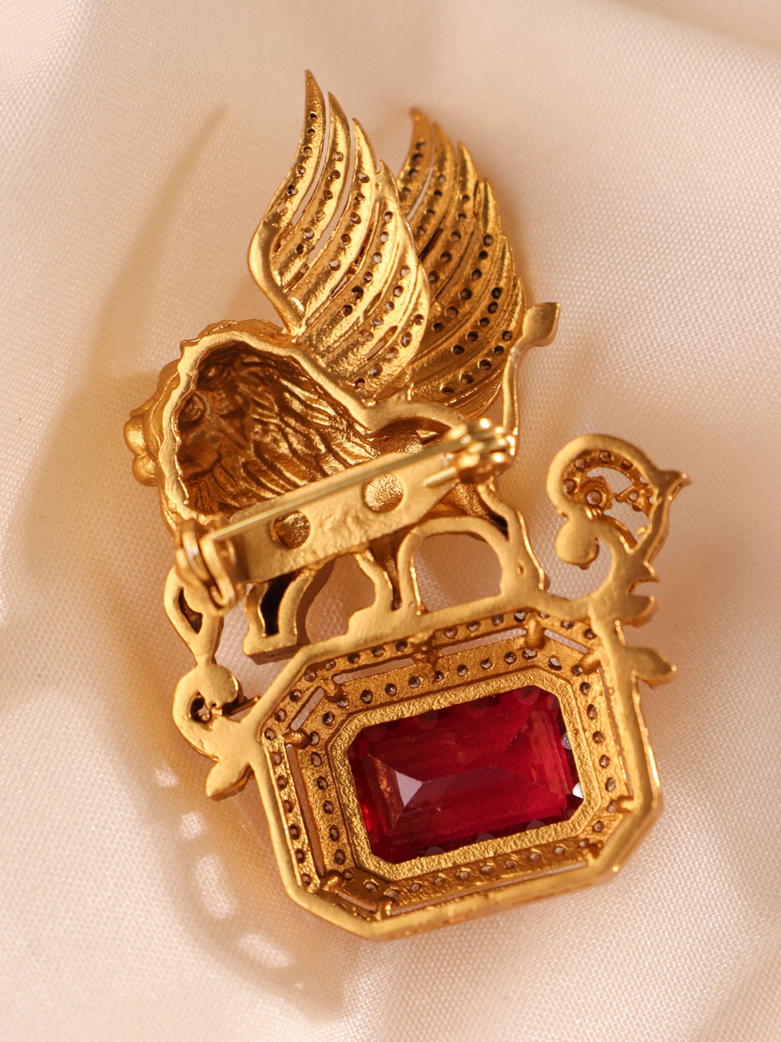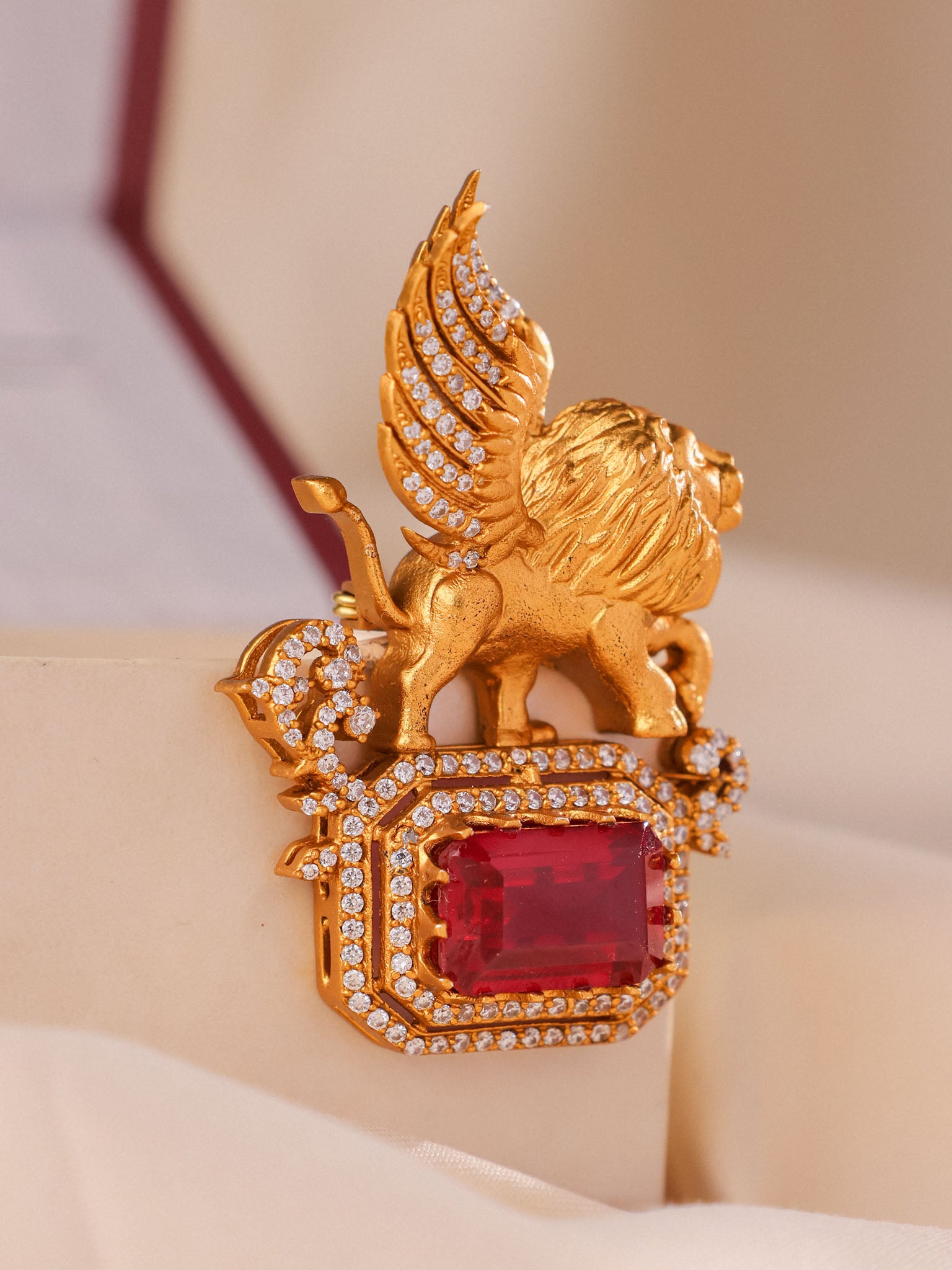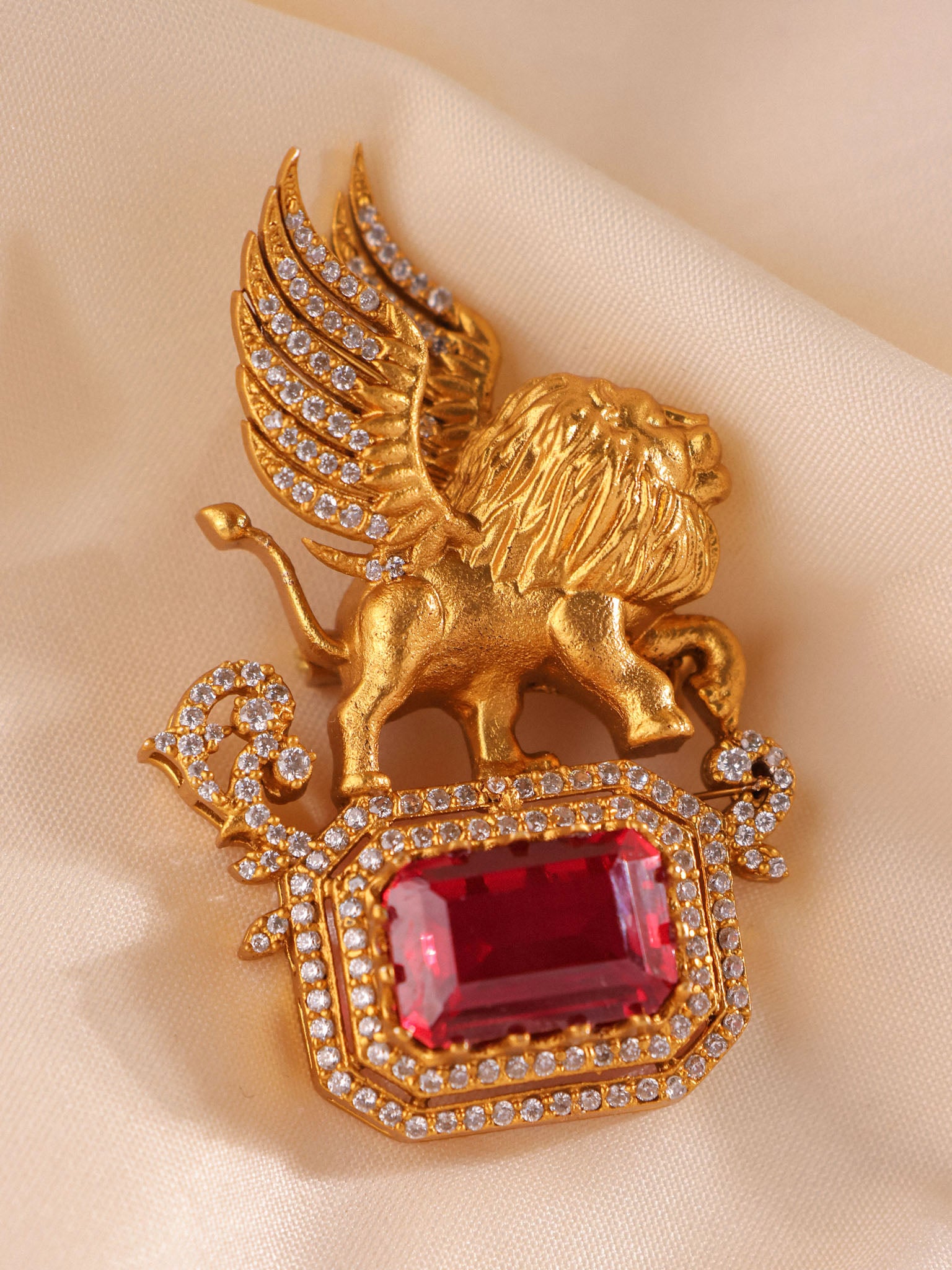 Command attention with the Averon Winged Lion Brooch, a bold symbol of strength and royalty. Featuring a finely sculpted winged lion perched above a richly faceted gemstone, this piece blends intricate craftsmanship with striking design.