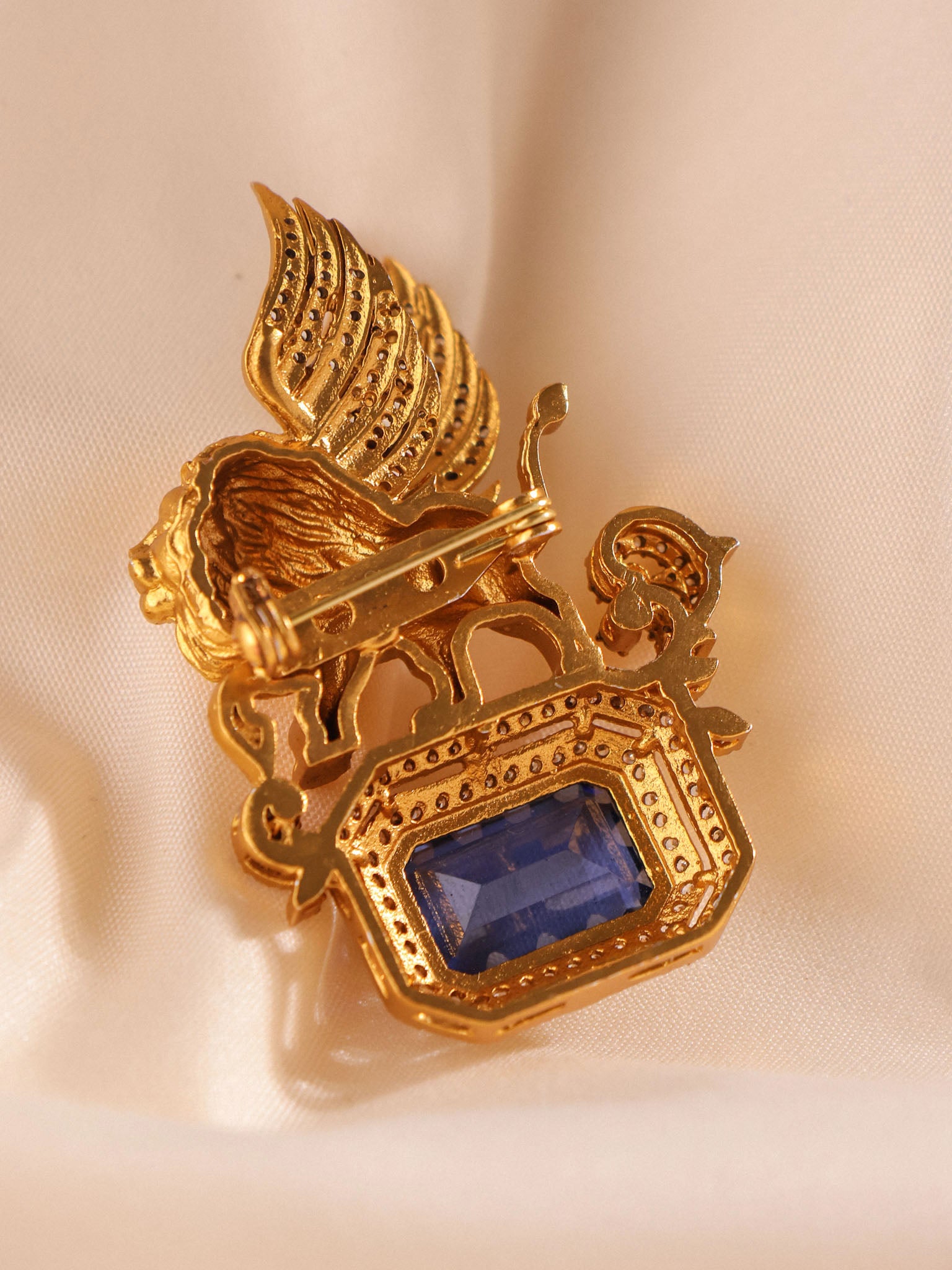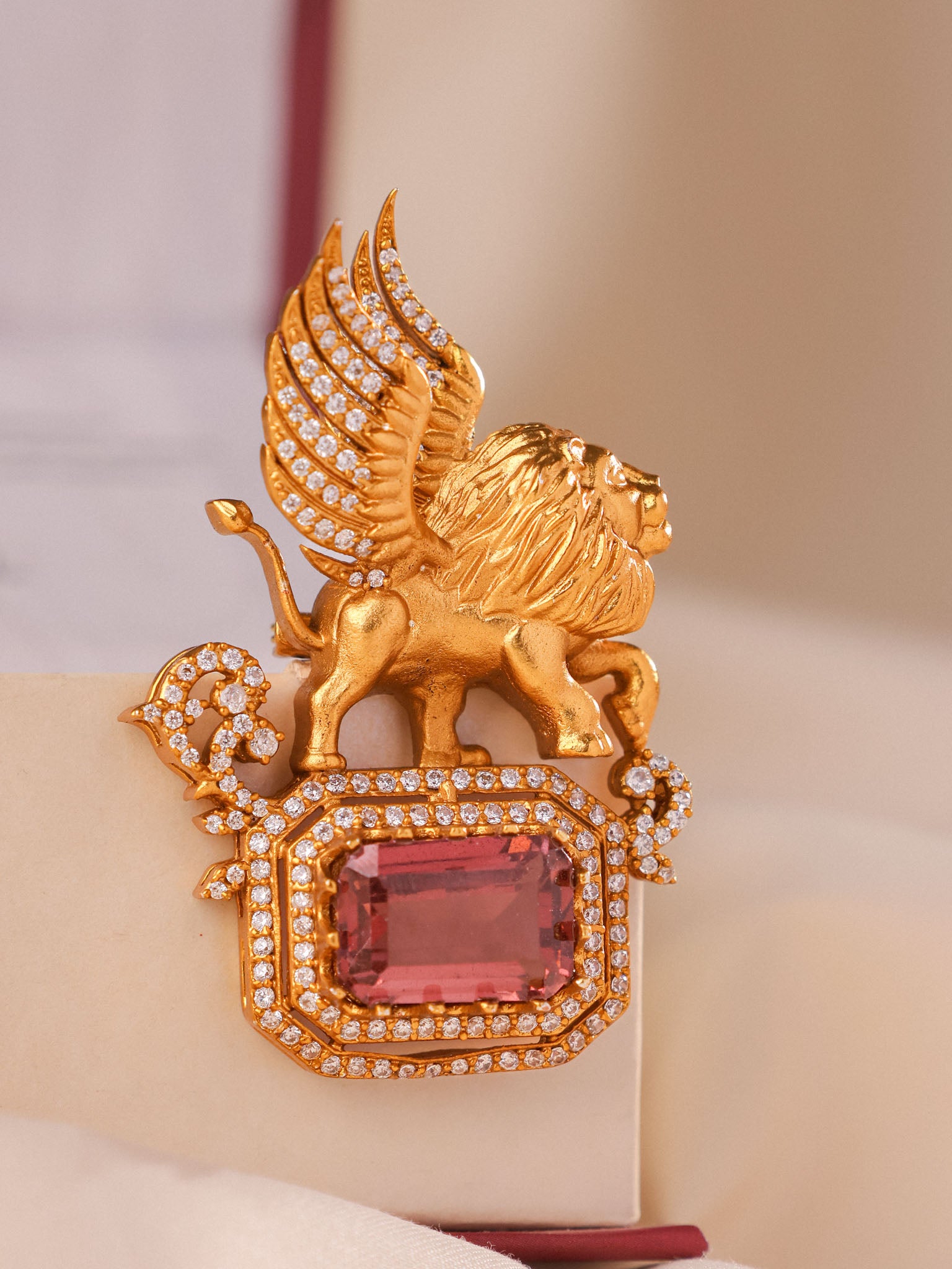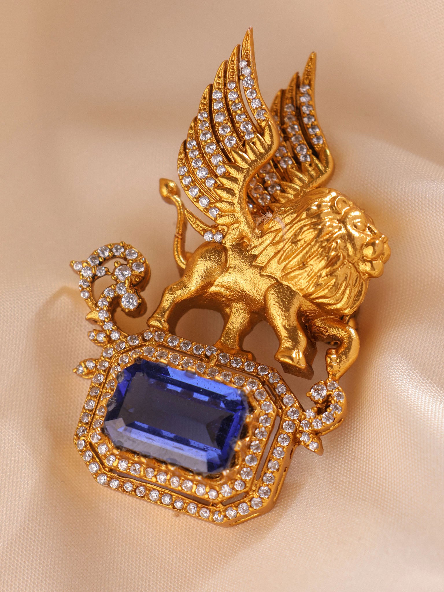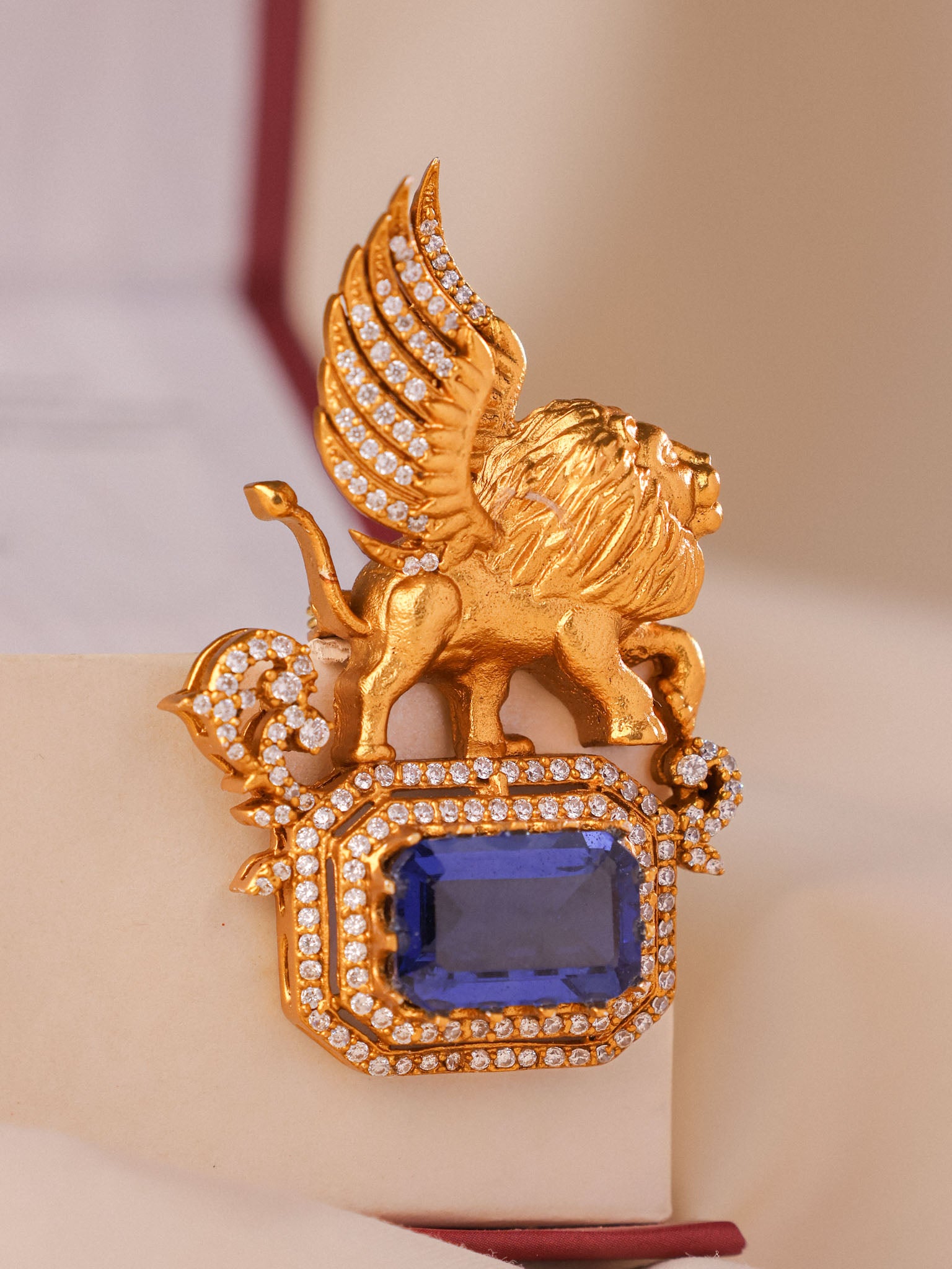 Command attention with the Averon Winged Lion Brooch, a bold symbol of strength and royalty. Featuring a finely sculpted winged lion perched above a richly faceted gemstone, this piece blends intricate craftsmanship with striking design.