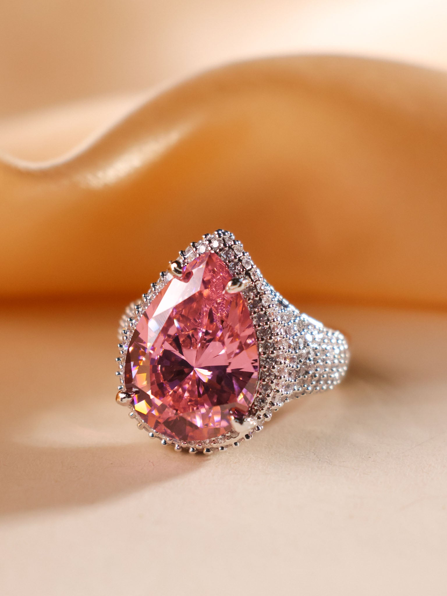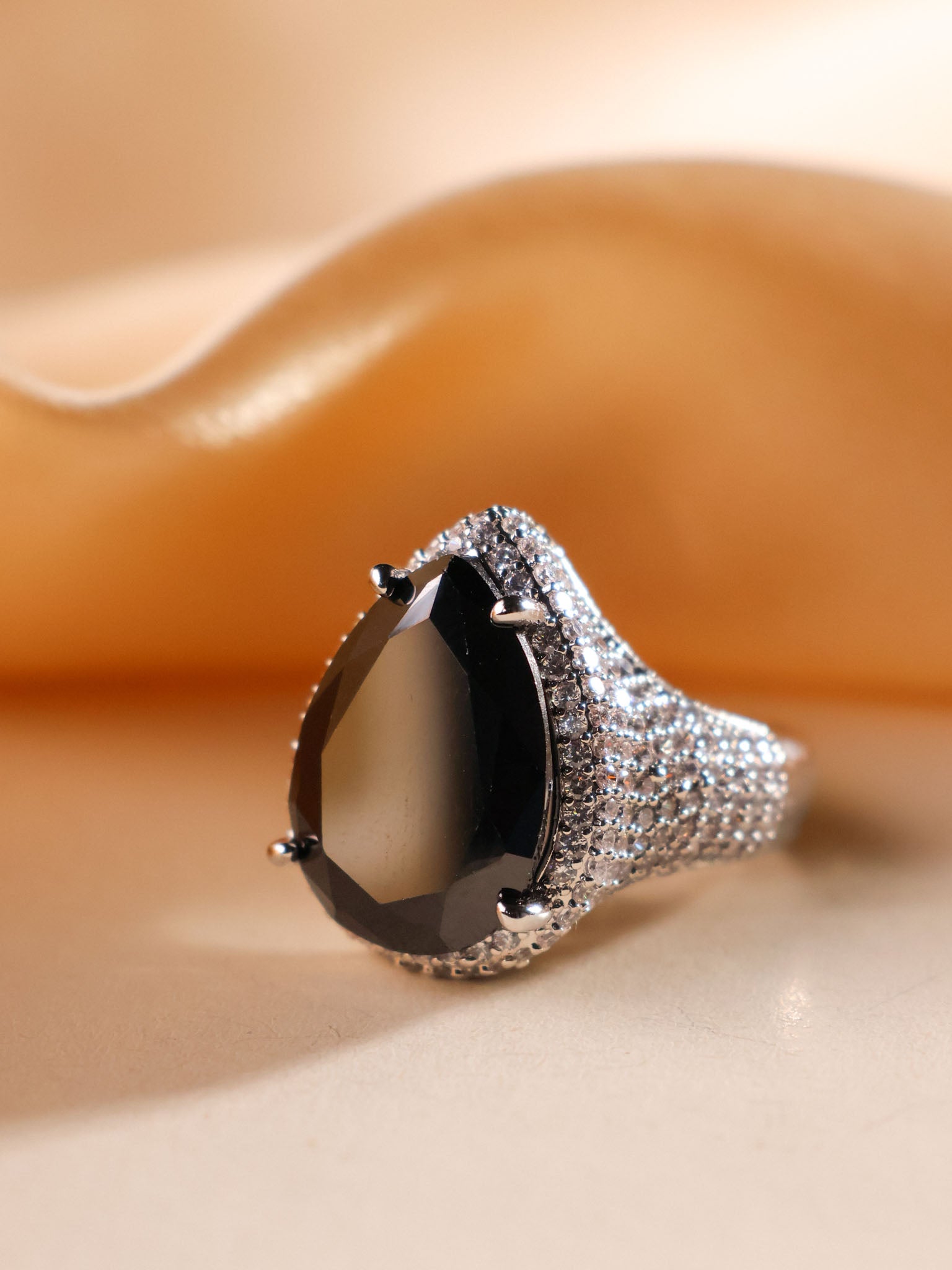 The Elara Statement Ring showcases a striking pear-shaped stone, embraced by a shimmering pavé halo that enhances its brilliance from every angle. Designed with a sleek, adjustable band, this ring offers a flawless fit while making a confident style statement.