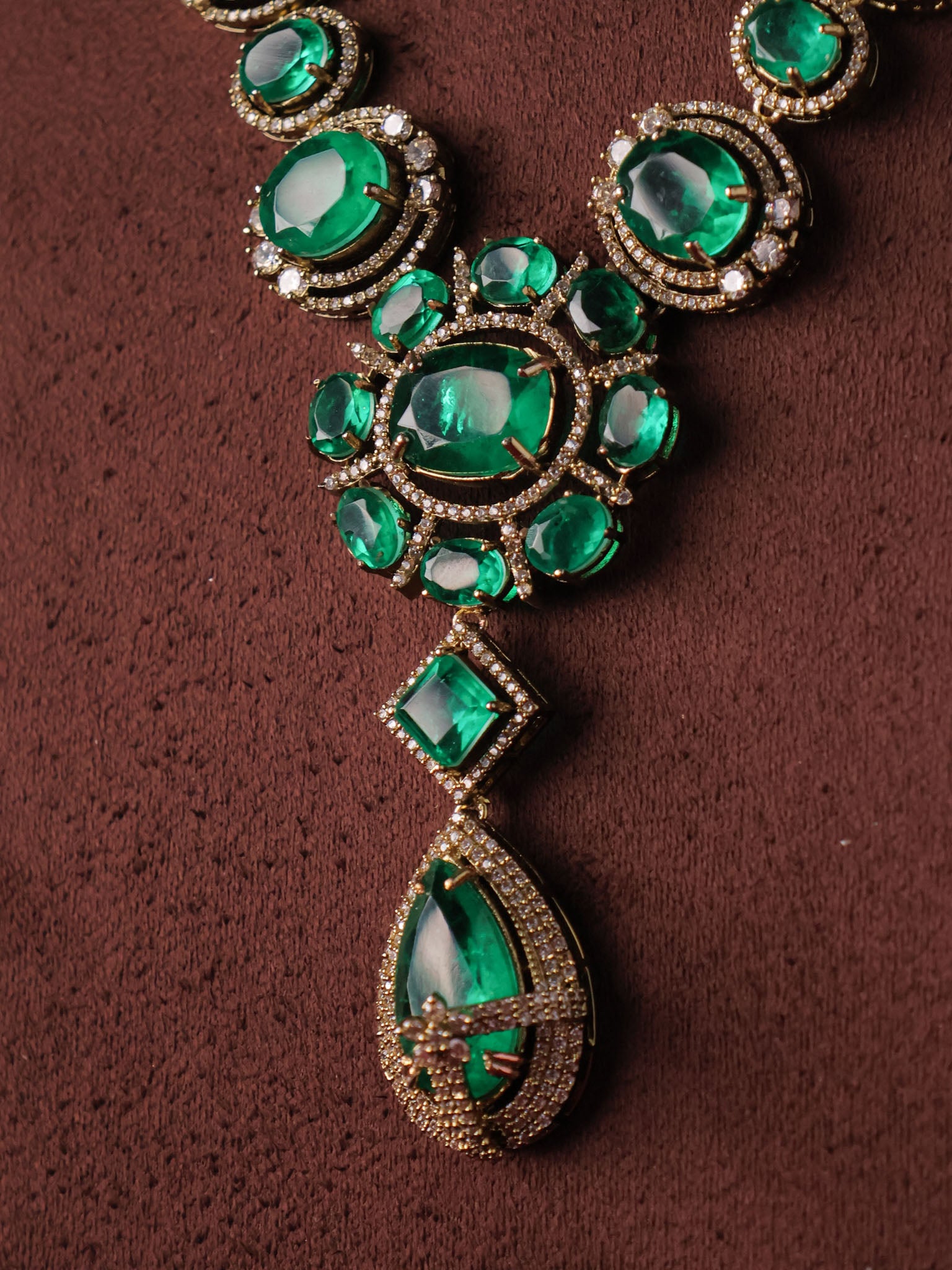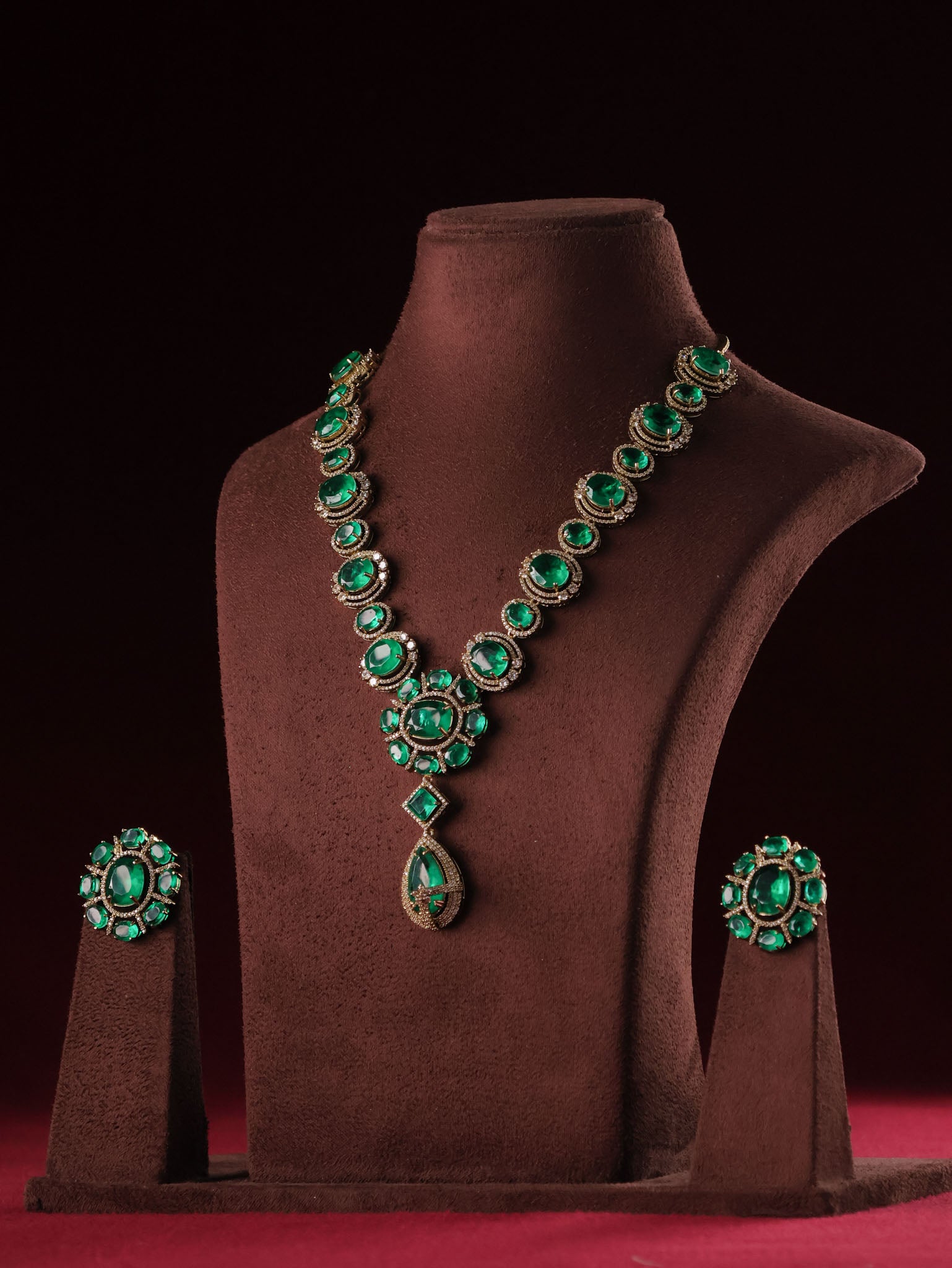 The Emerald Noor Polki Necklace Set is exquisitely handcrafted with deep emerald-green stones arranged in a regal, symmetrical flow. Each stone is framed with delicate Polki detailing, leading to a statement centre motif and a graceful drop that adds movement and grandeur to the design.