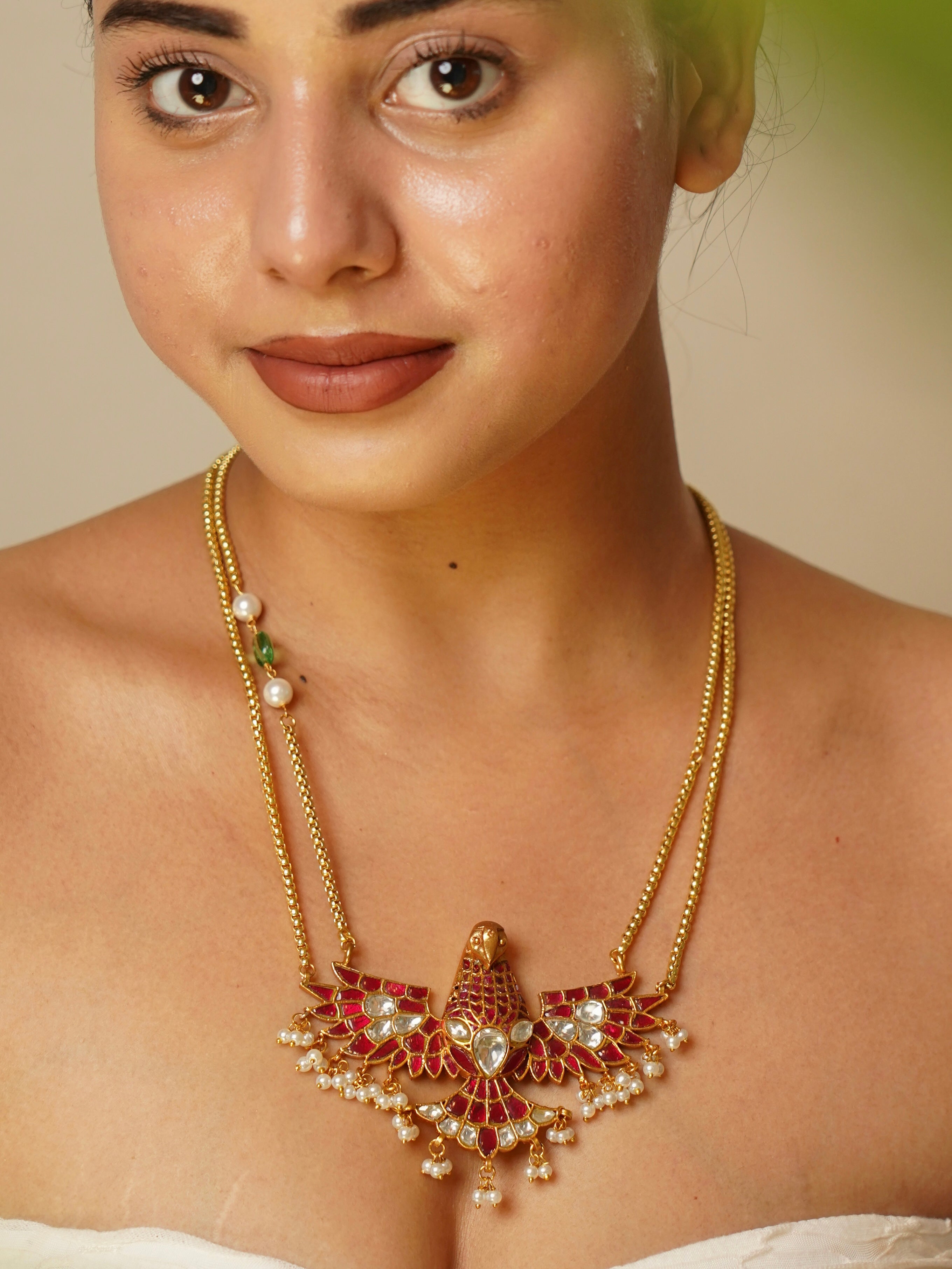 A regal statement of heritage artistry, the Garuda Rajat Jadau Necklace captures the divine strength of Garuda, the celestial eagle. Handcrafted in gold-plated finish, the wings are adorned with intricate jadau work in deep ruby tones, highlighted by uncut polkis and cascading pearl droplets. Perfect for connoisseurs of timeless Indian luxury, this masterpiece blends mythology with modern elegance, making it the centrepiece of any festive or bridal ensemble.
