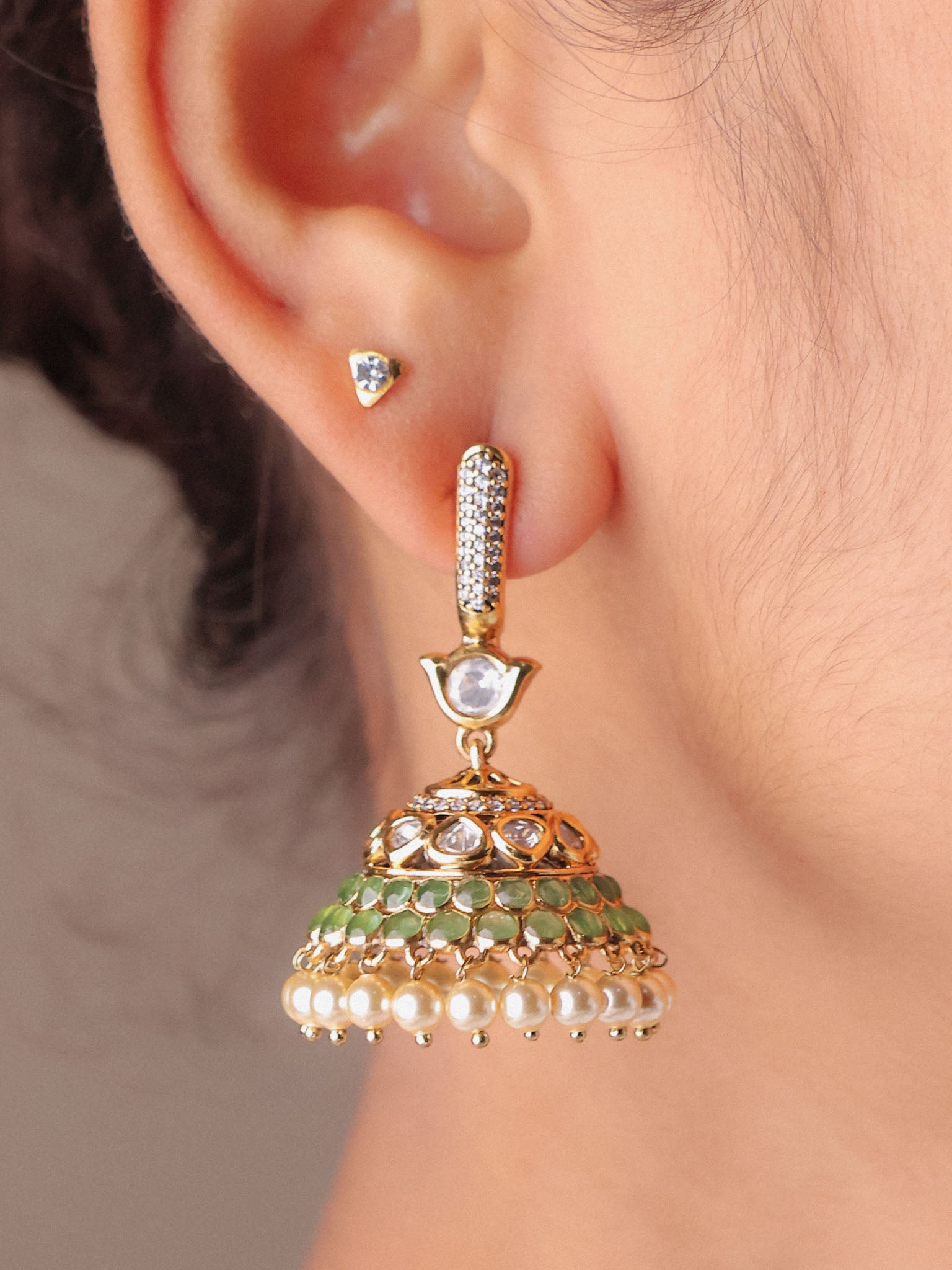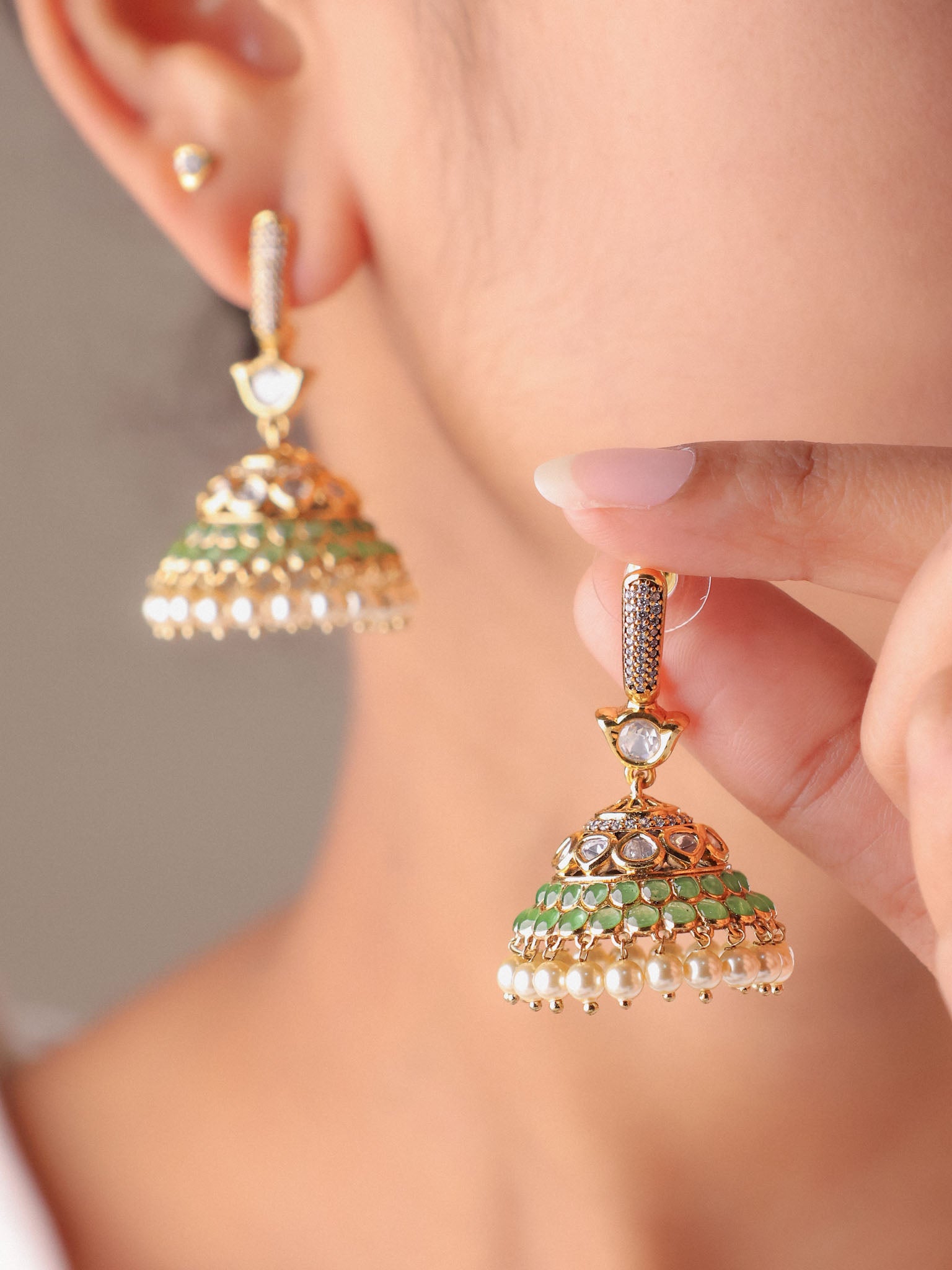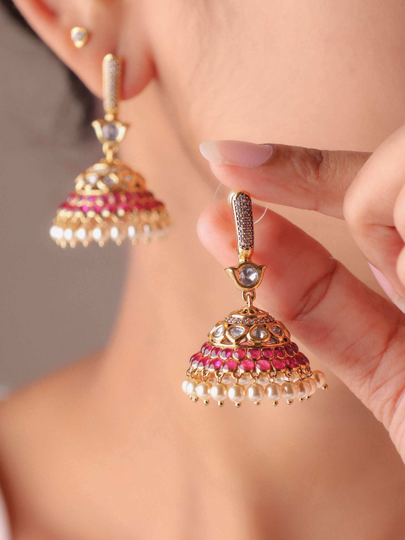 The Gulnaar Jhumka Drops bring together polki-inspired sparkle, vibrant enamel accents, and a delicate pearl fringe for that perfect festive finish. Featuring a sleek stone-studded top with a dome jhumka silhouette, this pair adds instant elegance—day-to-night, from mehendi to cocktail.