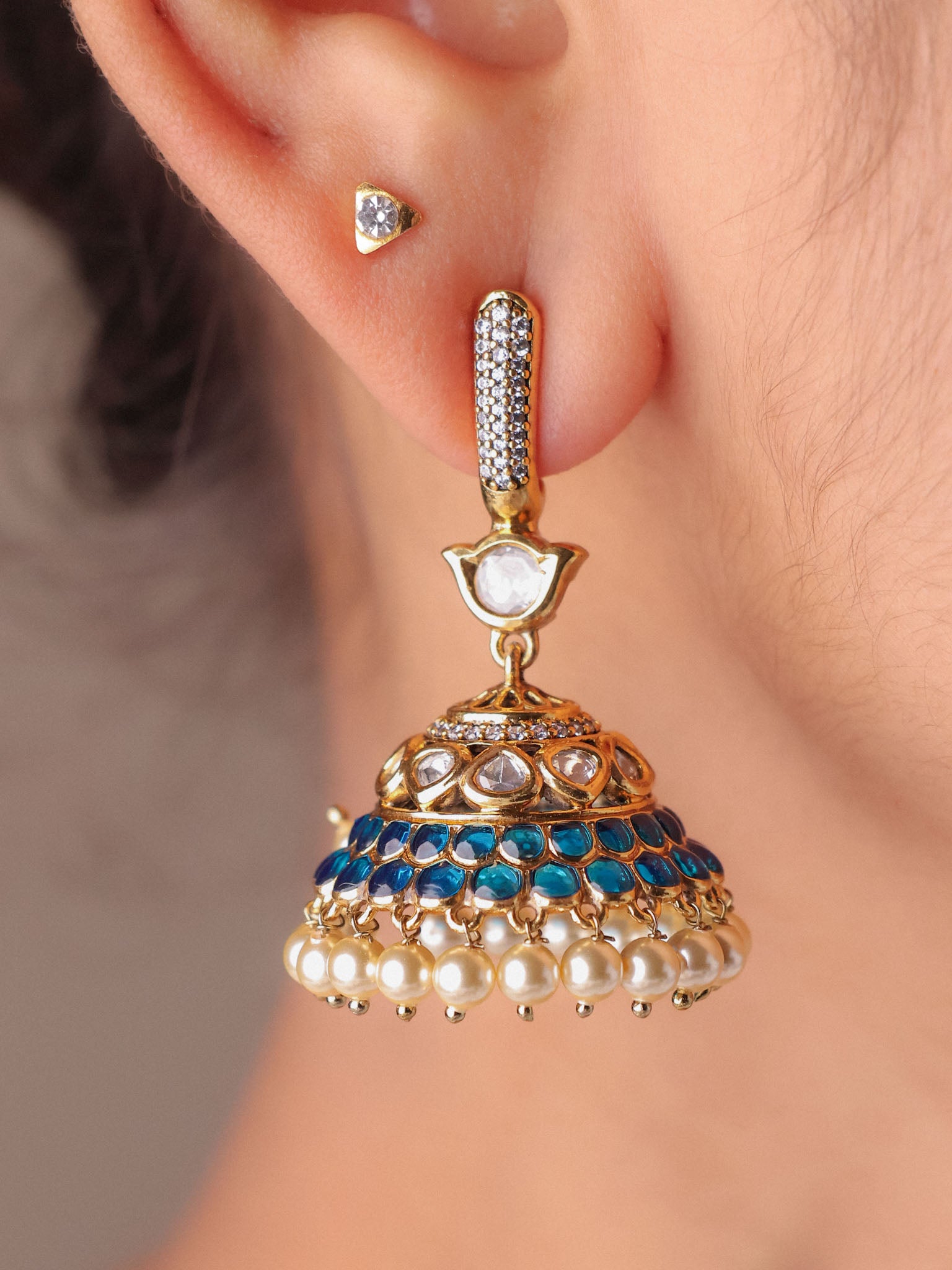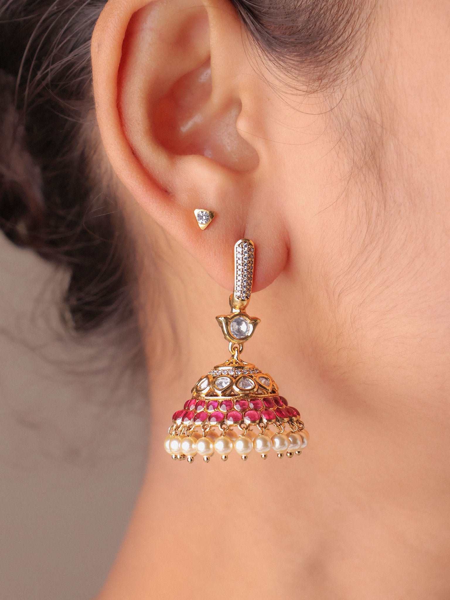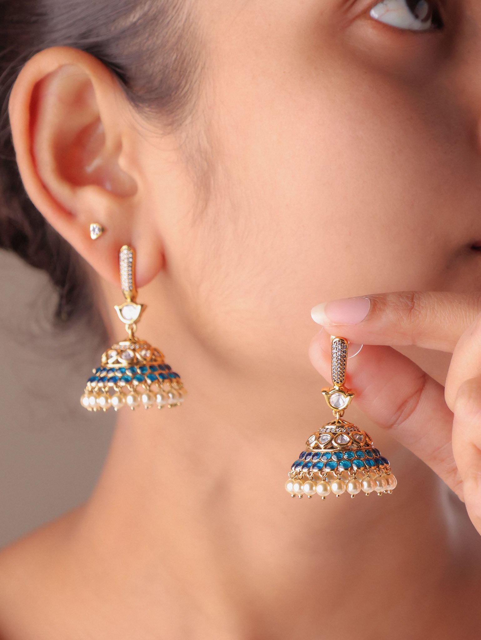 The Gulnaar Jhumka Drops bring together polki-inspired sparkle, vibrant enamel accents, and a delicate pearl fringe for that perfect festive finish. Featuring a sleek stone-studded top with a dome jhumka silhouette, this pair adds instant elegance—day-to-night, from mehendi to cocktail.
