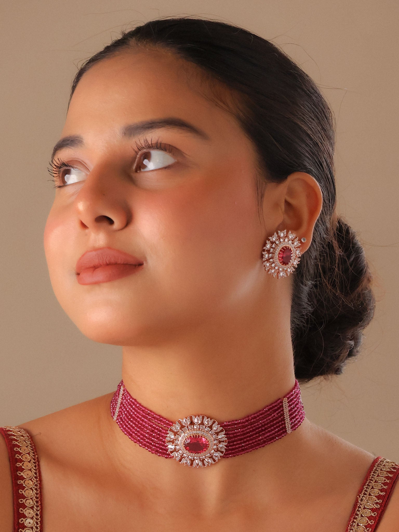 Statement necklace with hexagon emeralds and silver-toned accents in a geometric design