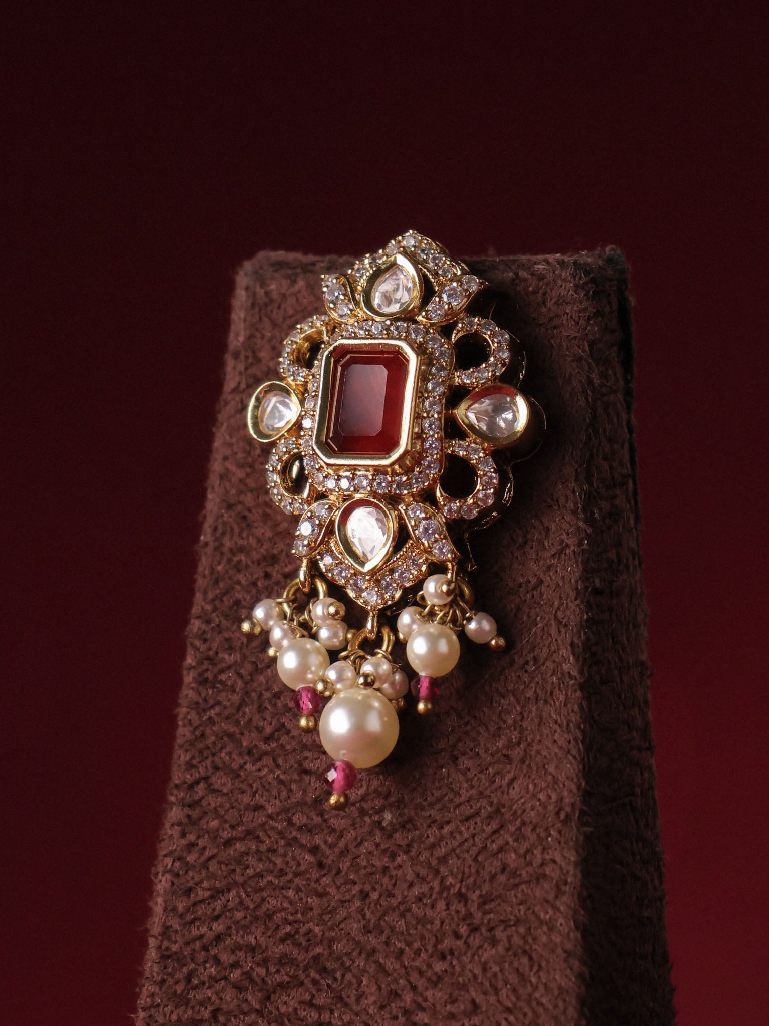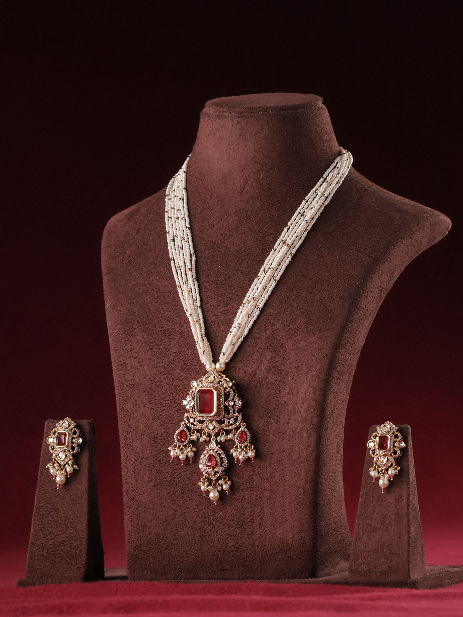 The statement pendant—rich in Polki brilliance, hand-set gemstones and intricate filigree work—drapes gracefully from a hand-strung seed-pearl mala, creating a silhouette reminiscent of royal heirlooms preserved in palace treasuries. Chandelier-style drops add movement and opulence, while the coordinating earrings elevate the ensemble into a complete luxury statement.
