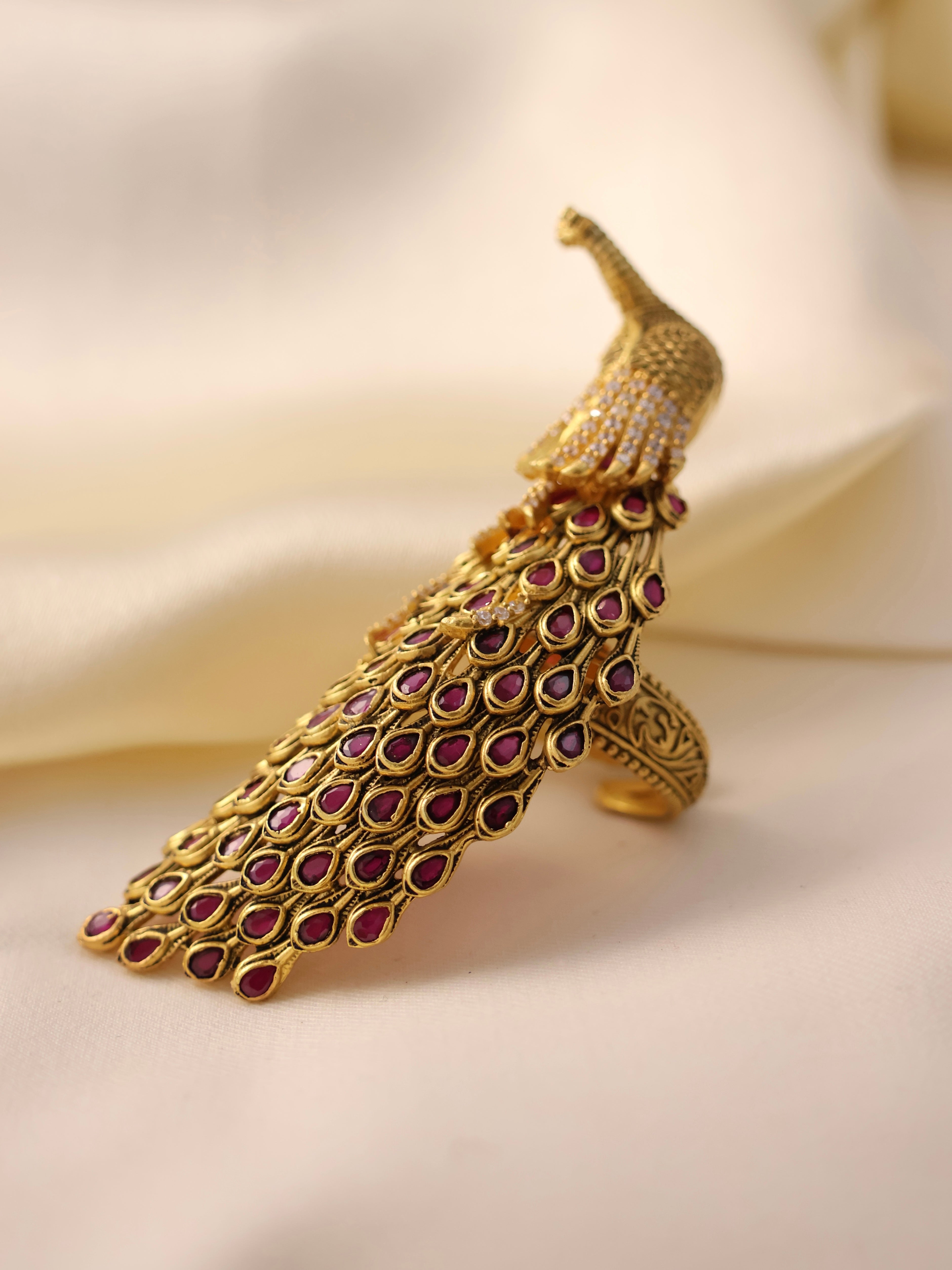 Experience regal charm with the Majestic Peacock Empress Ring, crafted in gold with vibrant gemstone-studded feathers. Designed for a perfect fit with its adjustable size, this ring embodies grace and heritage, ideal for those who love bold, exquisite jewelry.