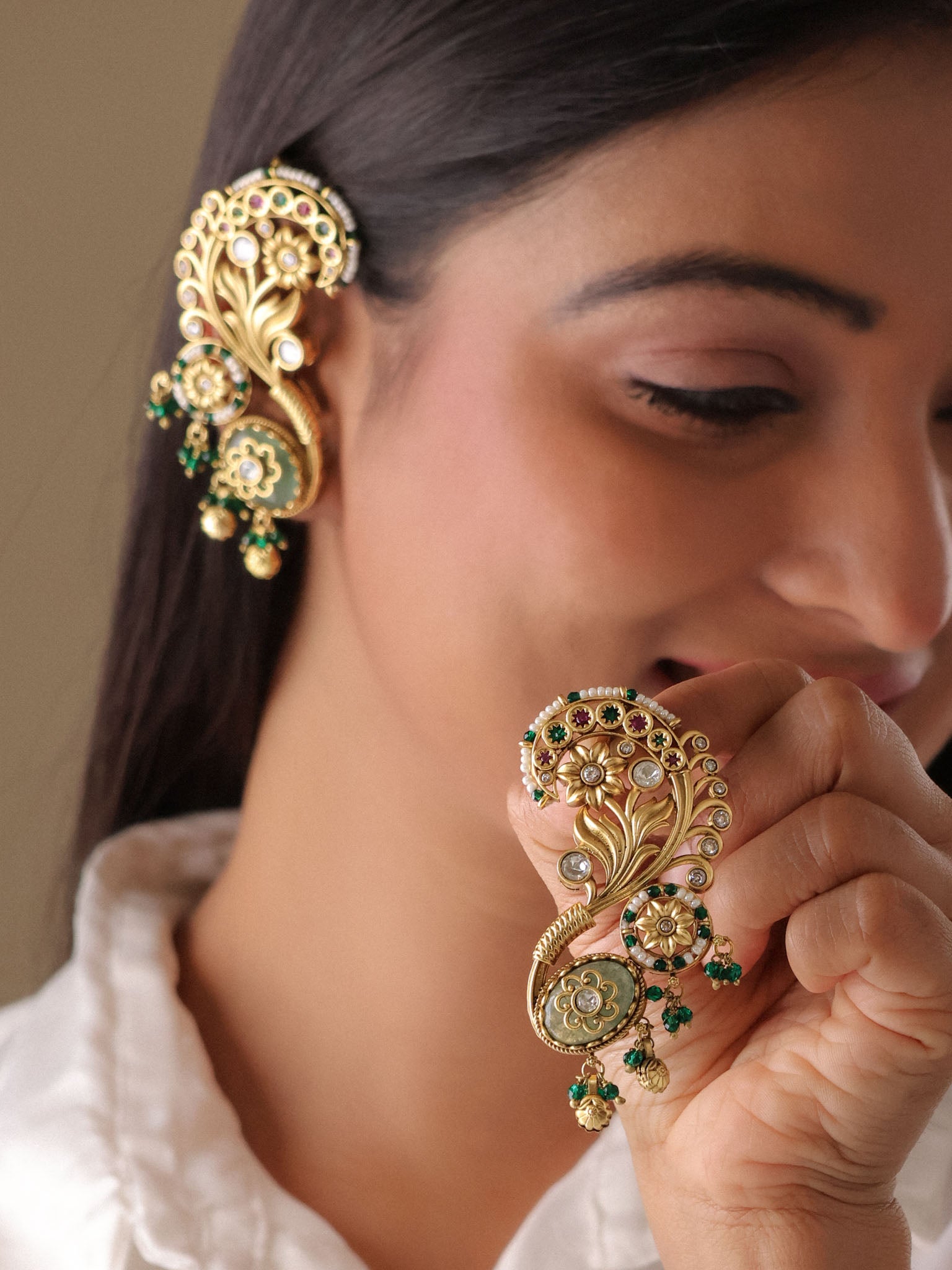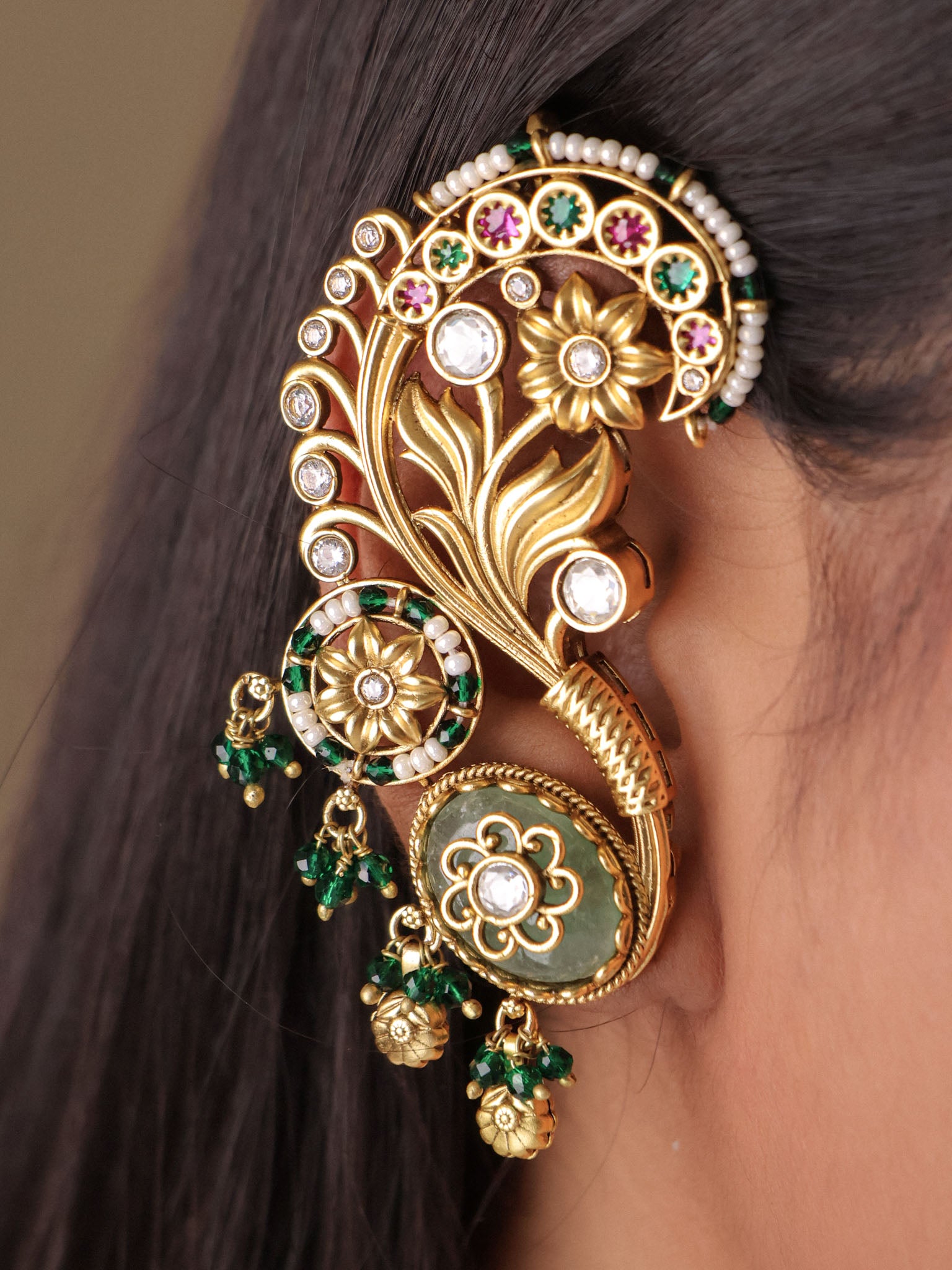 Perfect for weddings, festive celebrations, and couture styling, this heritage ear cuff transforms any outfit into a royal ensemble—whether paired with silk sarees, lehengas, or contemporary fusion wear.