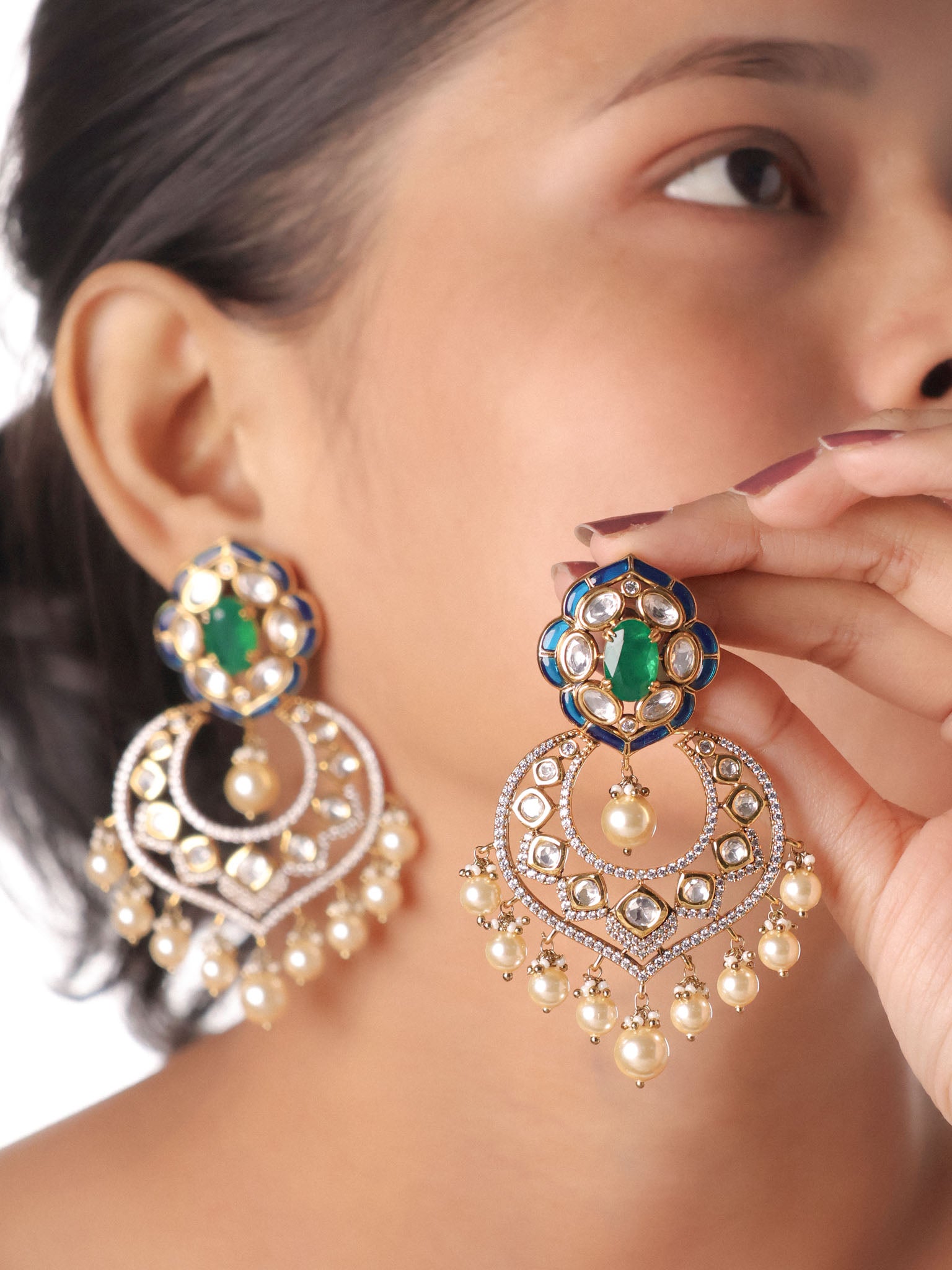 - Double crescent frame with kundan & CZ micro-pavé