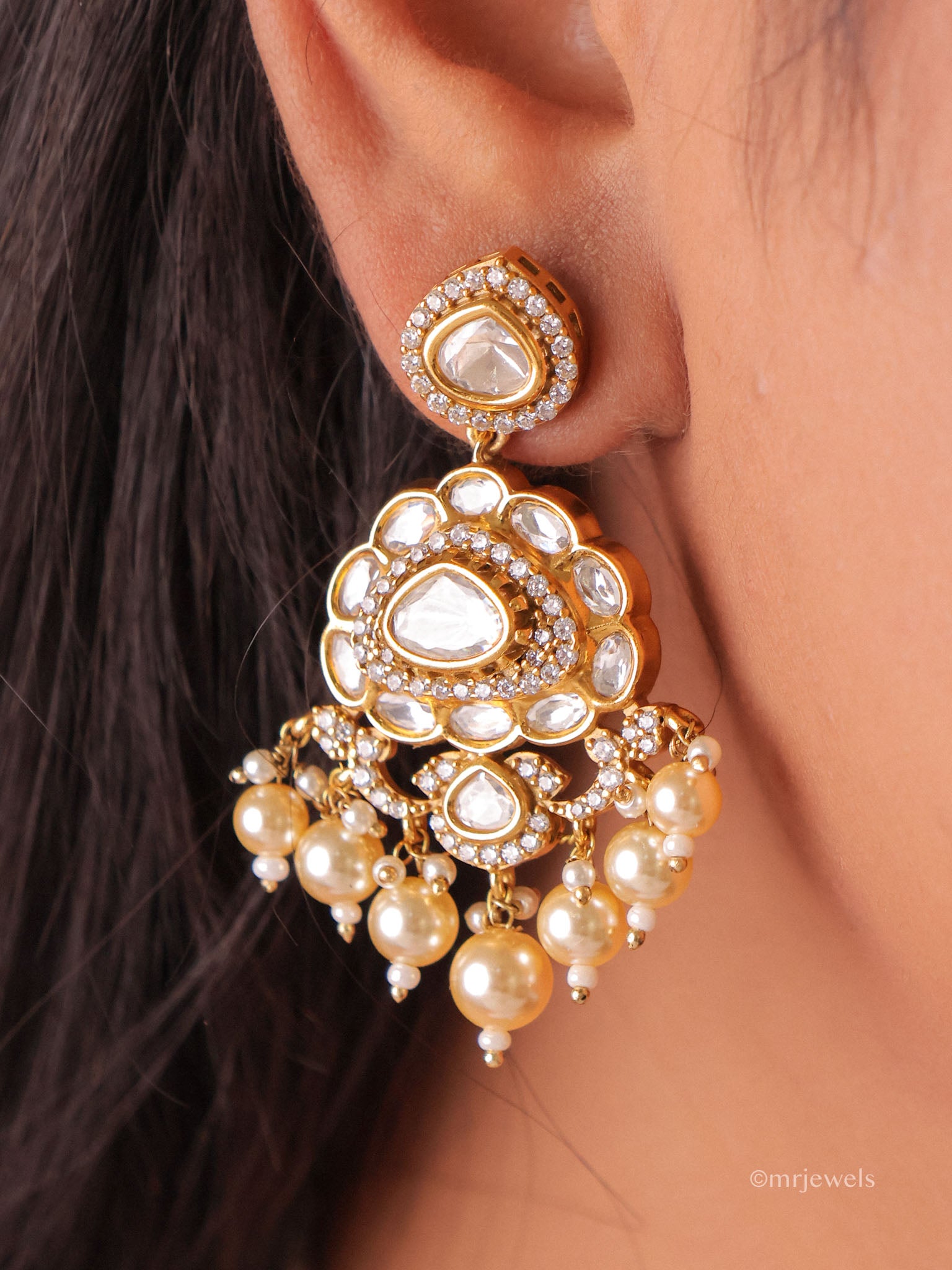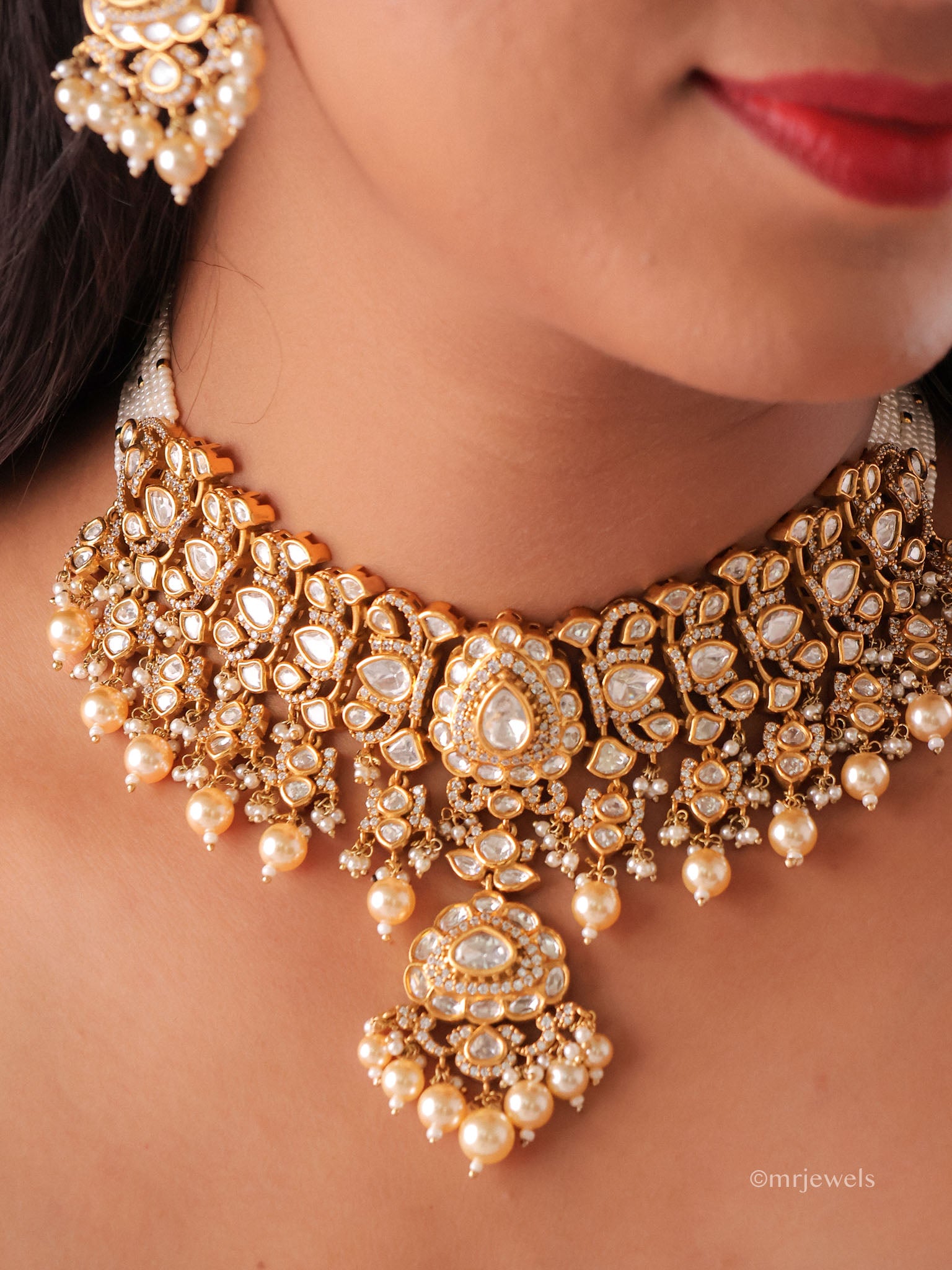 An exquisite expression of royal elegance, the Mehrasa Polki Royal Set is crafted with intricate polki detailing and layered brilliance that captures timeless grandeur. Adorned with delicate pearl drops and a statement central pendant, this set reflects the richness of heritage craftsmanship with a refined, regal finish.