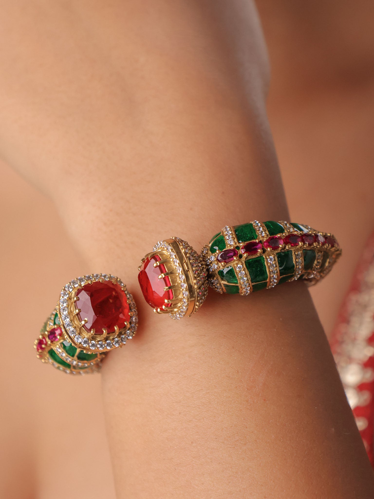 The best and richest you can find in Indo western kada’s. A front open kada in a rock solid design, that has the richness and looks of precious polkis and emerald and ruby doublets. A blend of Meenakari with coloured stones and diamonds that outshine.