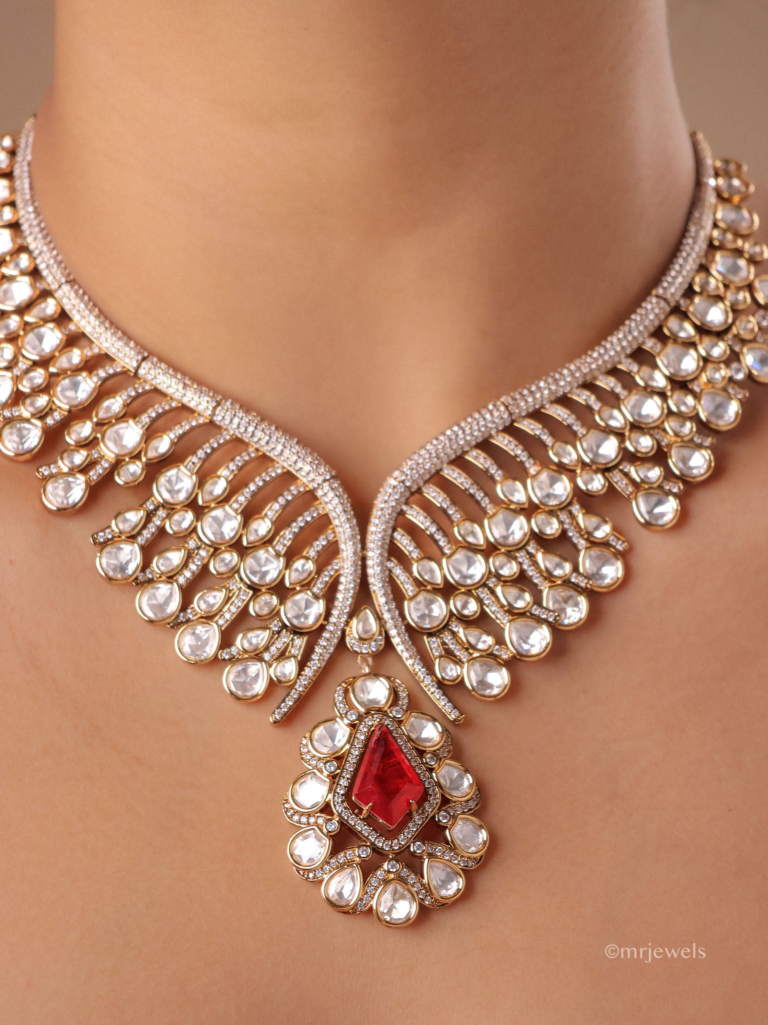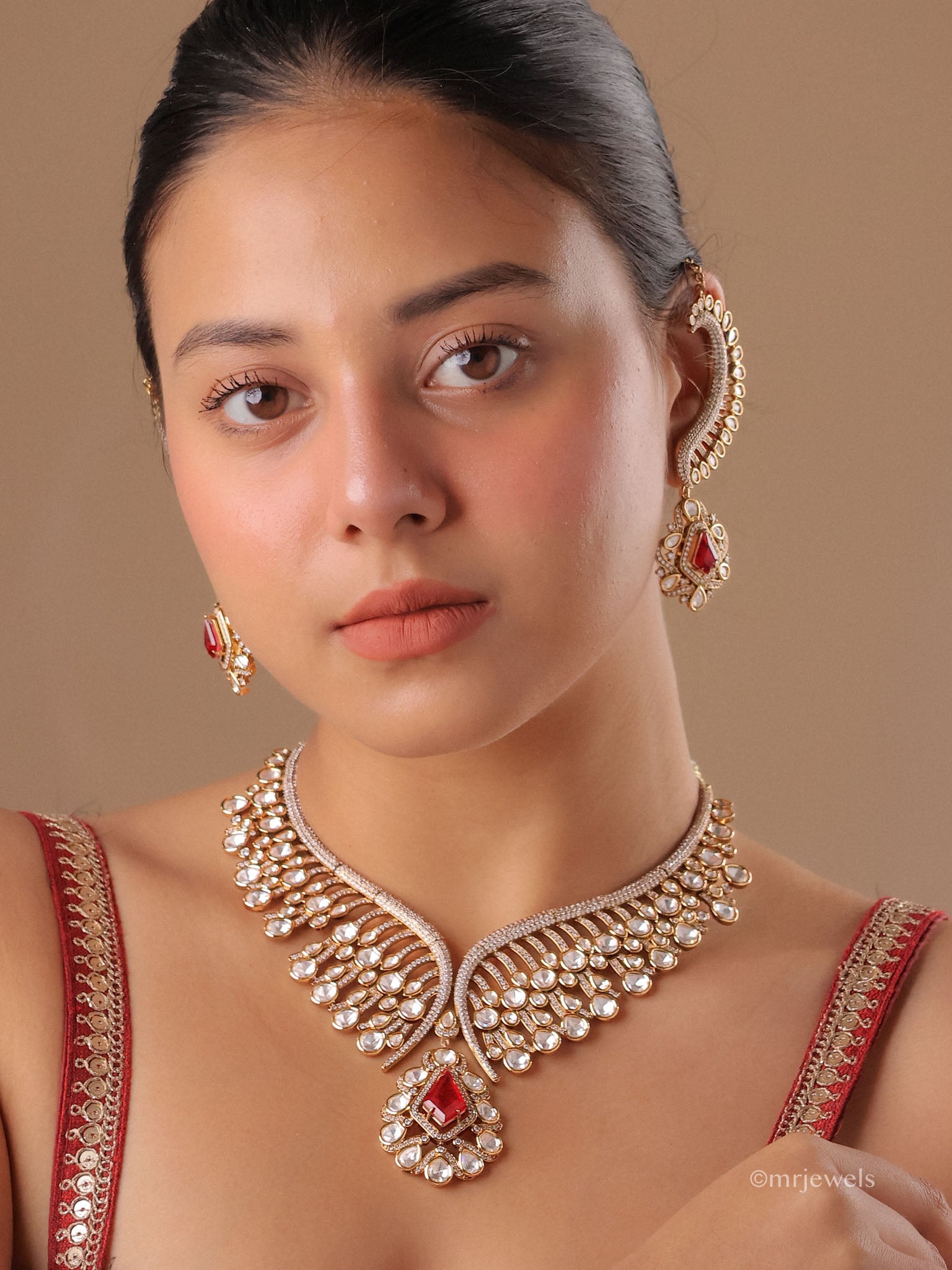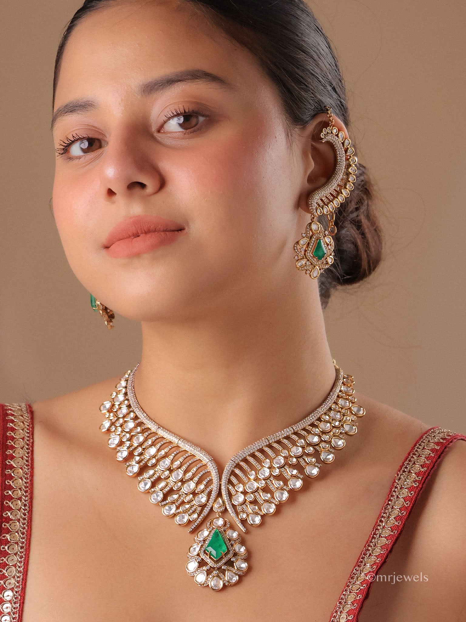An exquisite celebration of timeless elegance, the Naaz Polki Statement Necklace Set showcases intricately set Polki-style stones arranged in a graceful wing-inspired silhouette. The luminous design is accentuated with a striking gemstone pendant, adding depth and regal charm to the piece. Paired with dramatic ear-cuff style earrings, this set captures the grandeur of traditional craftsmanship with a modern statement appeal.