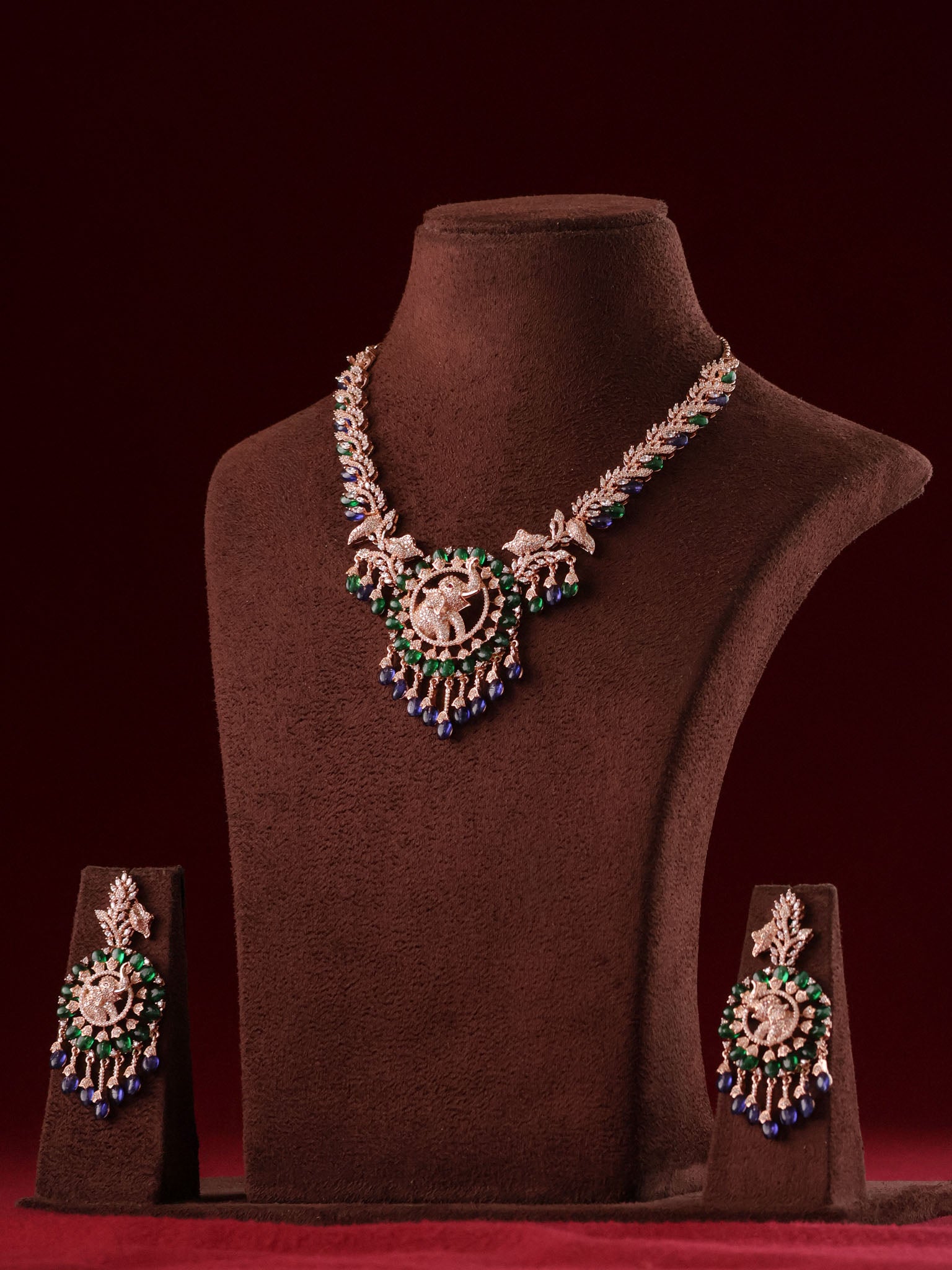 Finished with graceful bead drops and paired with matching statement earrings, this set is perfect for bridal wear, festive celebrations, and regal soirées. Each detail is thoughtfully crafted to create a look that feels timeless, powerful, and unforgettable.