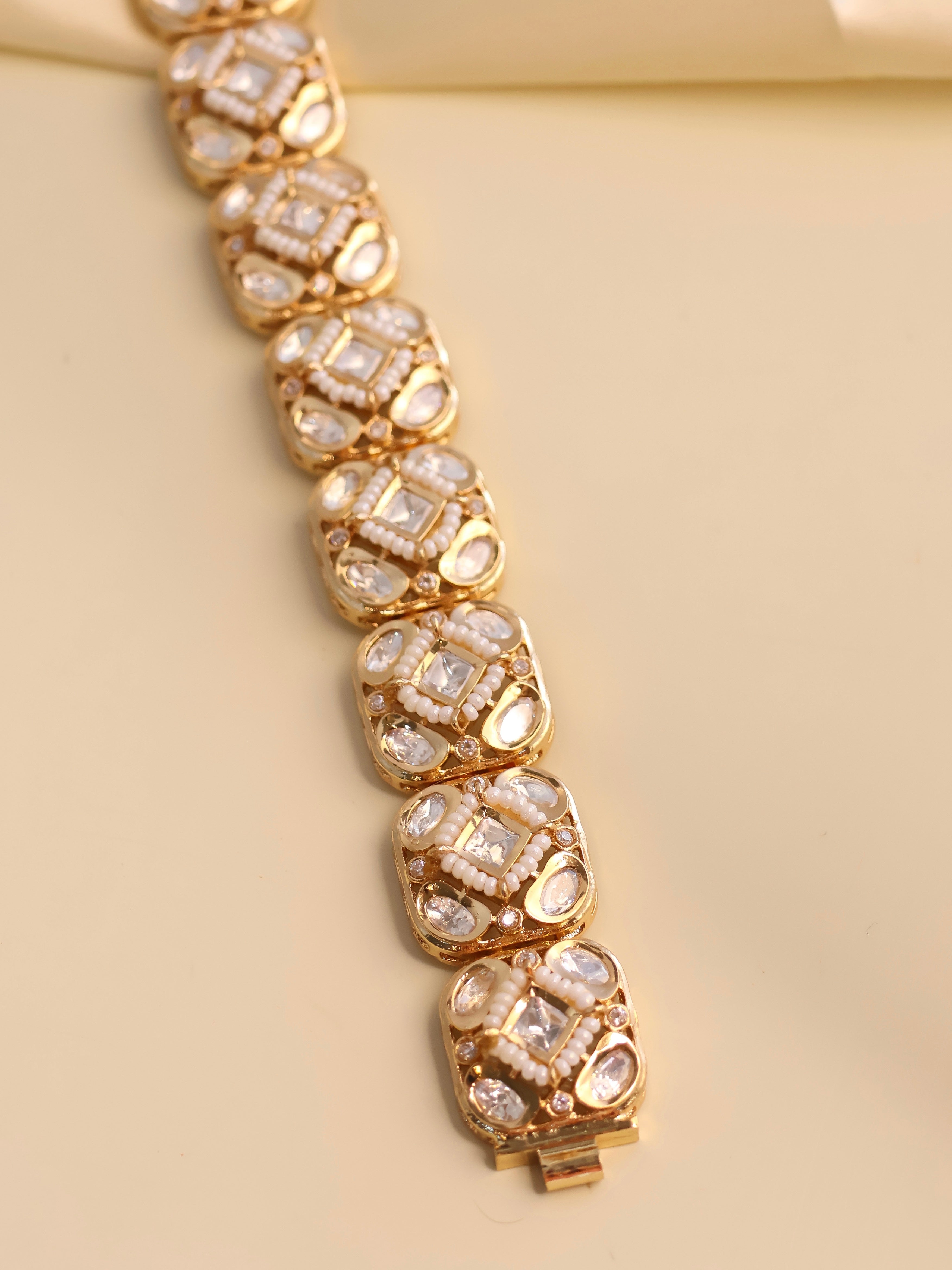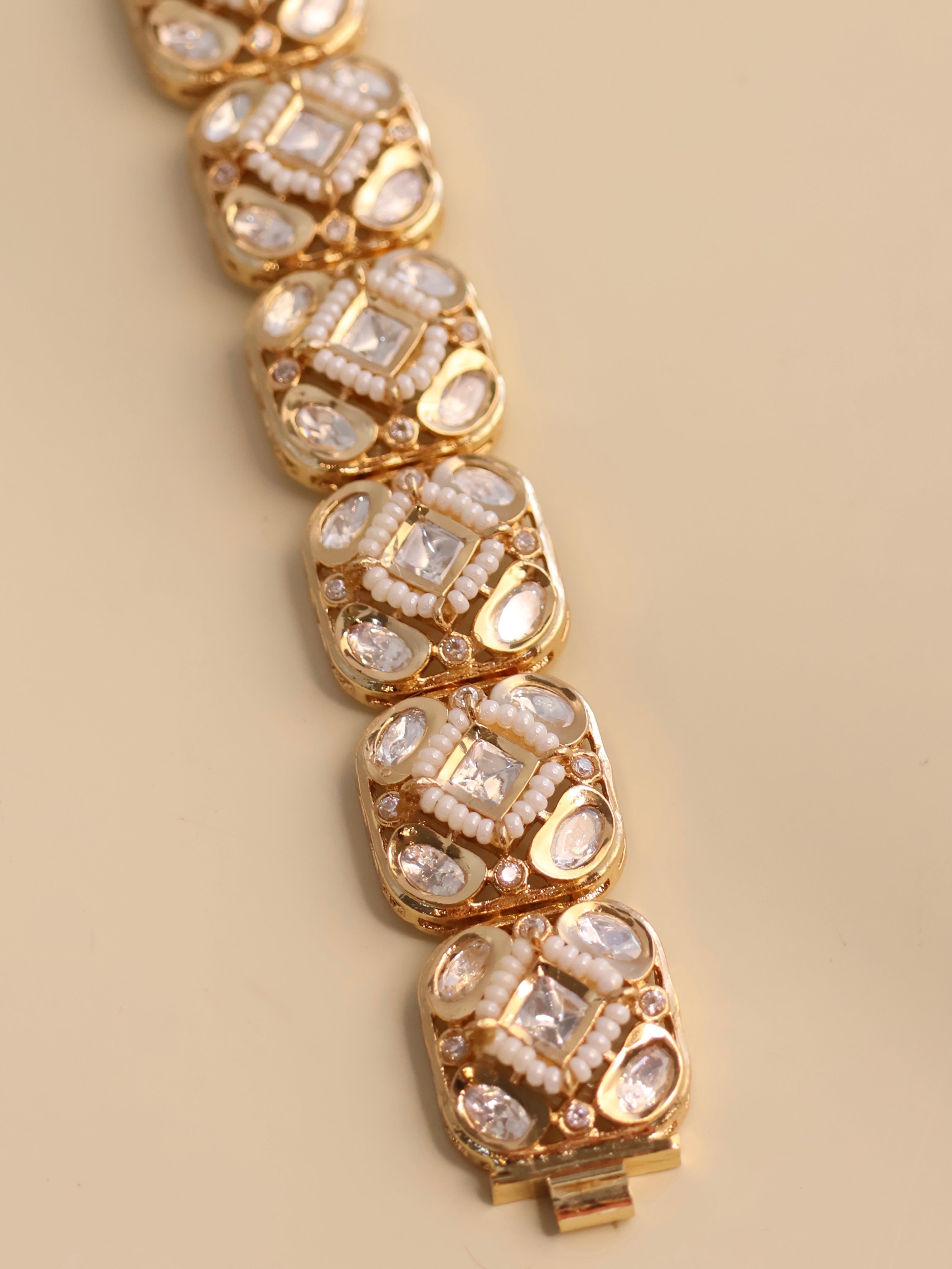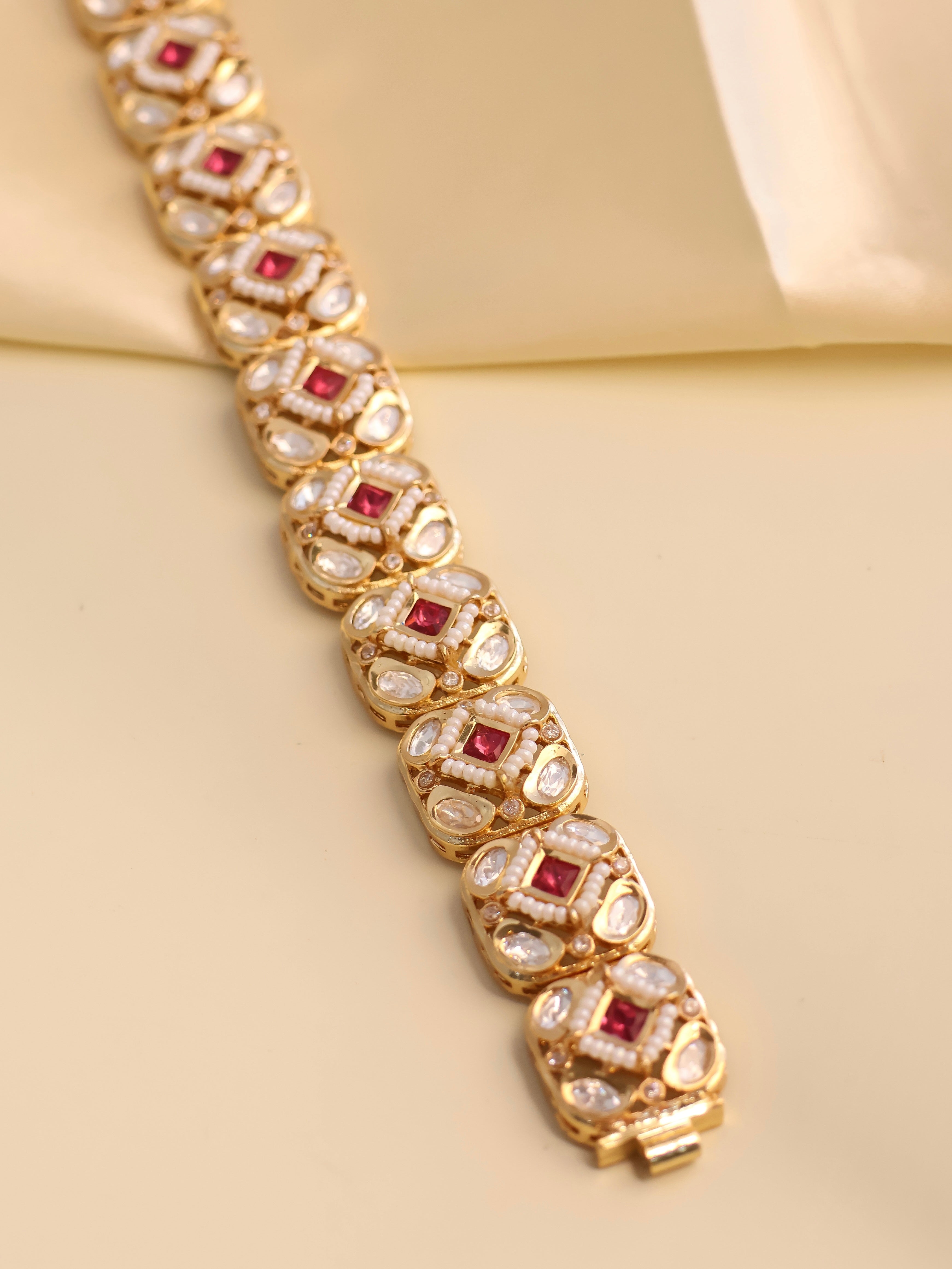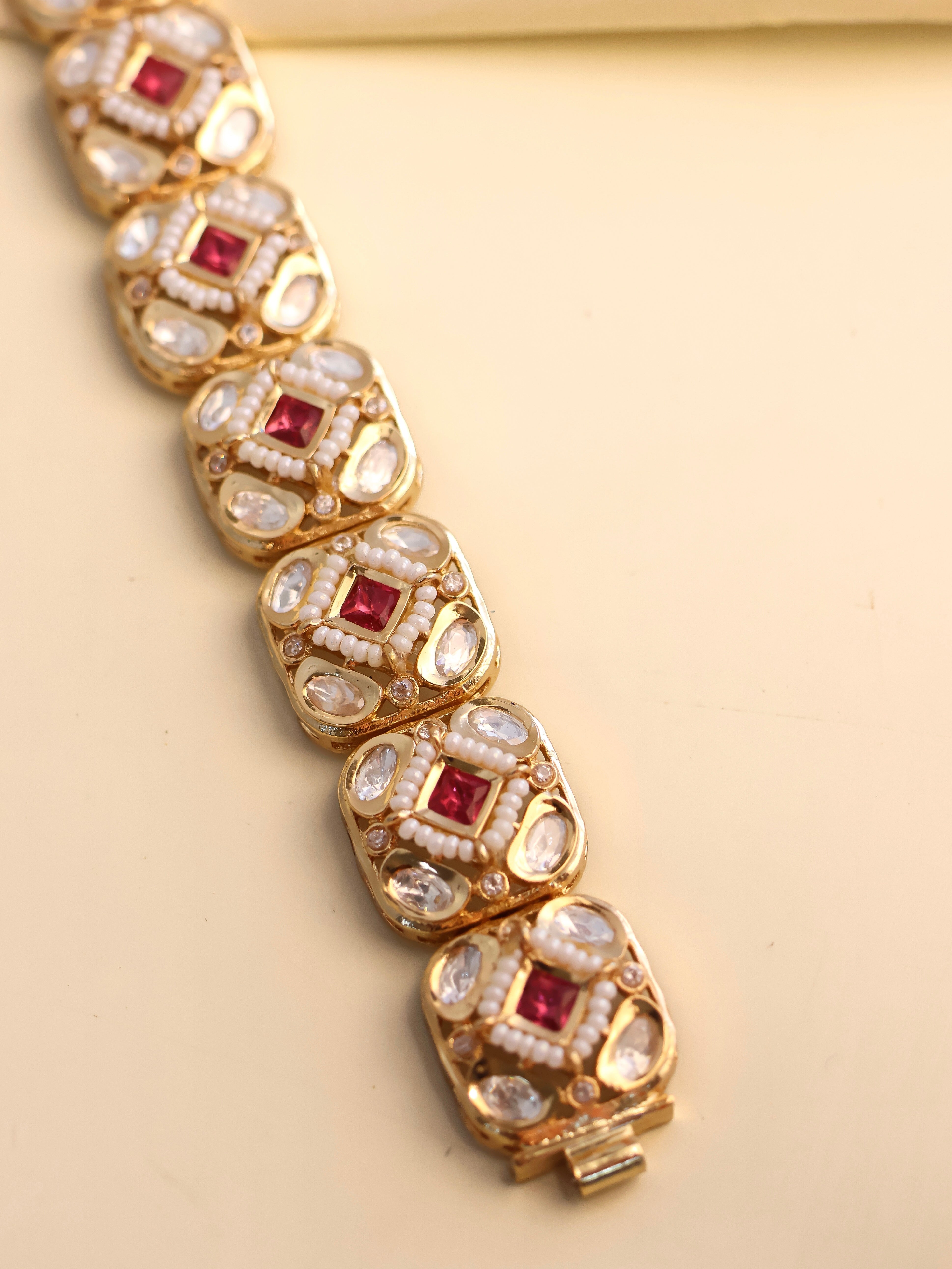 A tribute to timeless Indian craftsmanship, the Noor Royale Kundan Bracelet is adorned with hand-set uncut stones, delicate pearls, and a luxurious micron gold polish. Available in both classic white kundan and bold ruby red center variants, this bracelet offers regal sophistication in every link.