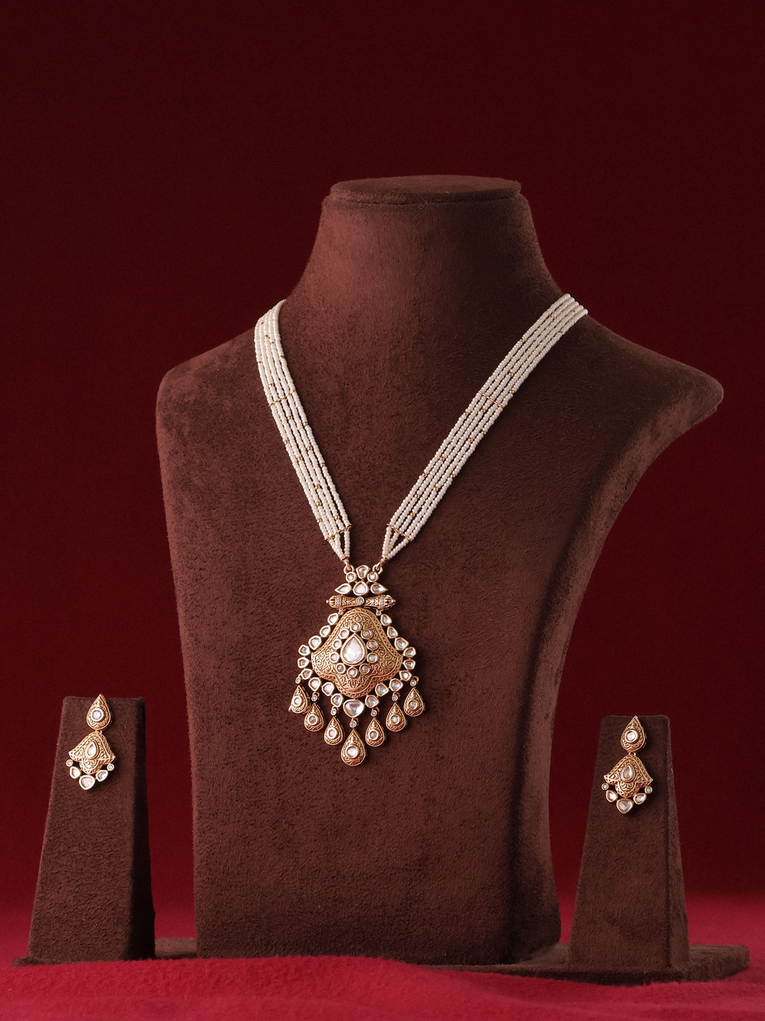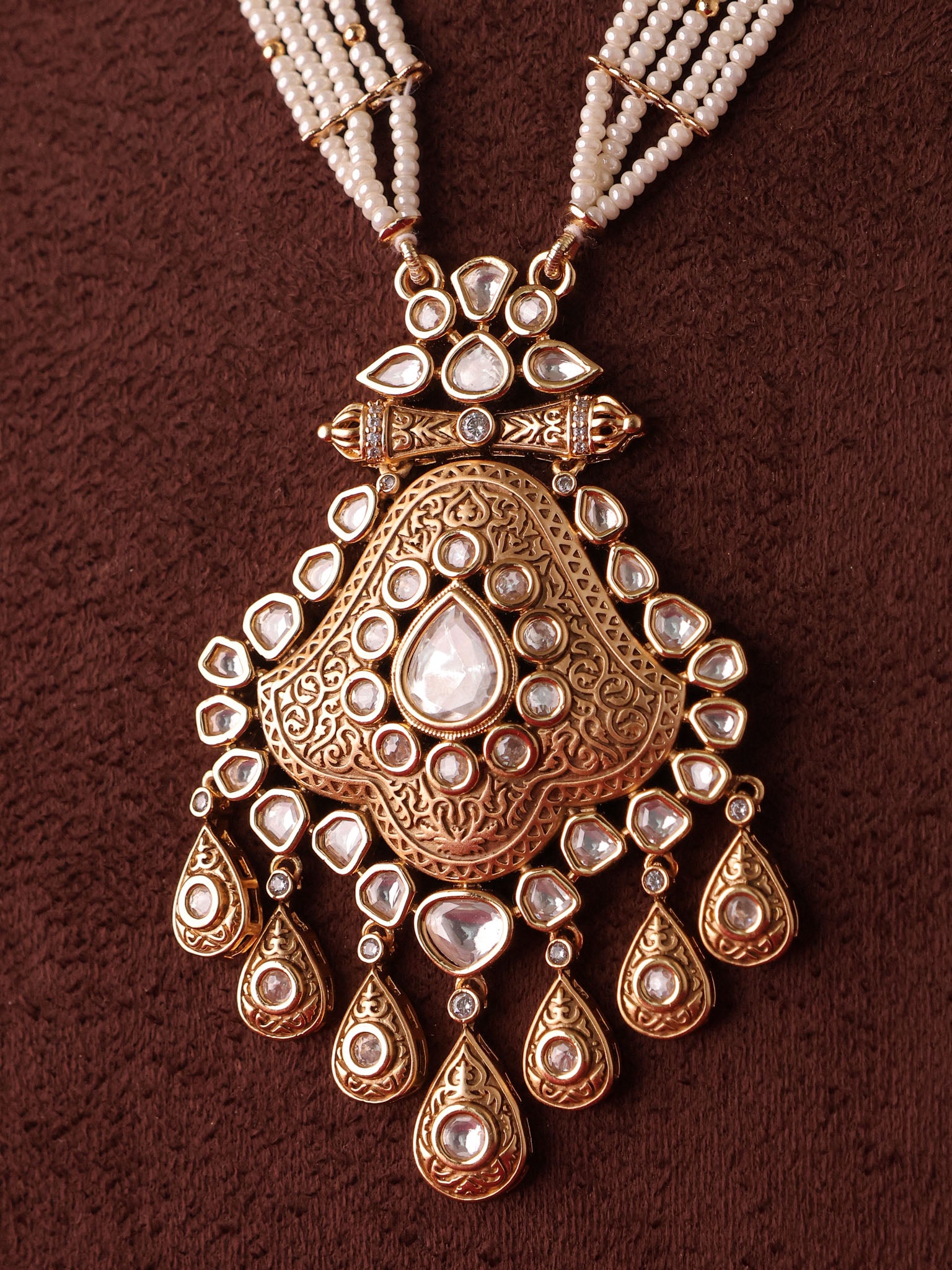 This heritage pearl polki necklace features multiple strands of delicate ivory beads, leading to a majestic elongated pendant adorned with intricate filigree detailing and luminous polki stones. The cascading teardrop accents add graceful movement, elevating the design with bridal grandeur.