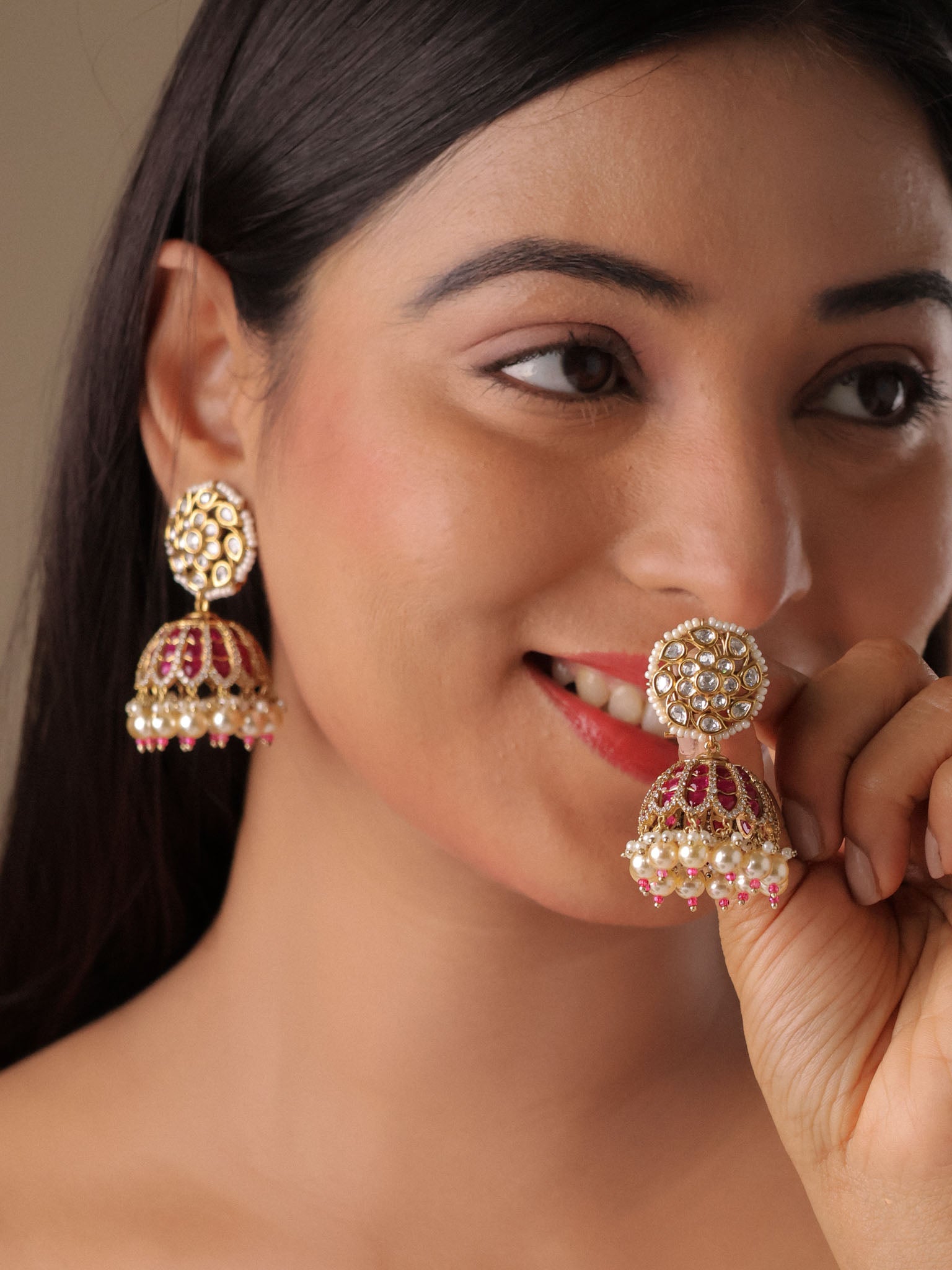 These Jhumkas are meticulously crafted in silver alloy, featuring exquisite alloy polki work that adds timeless elegance. Accented with delicate pearl drops in green and red, they offer a refined blend of traditional artistry and vibrant color, perfect for enhancing any sophisticated ensemble.
