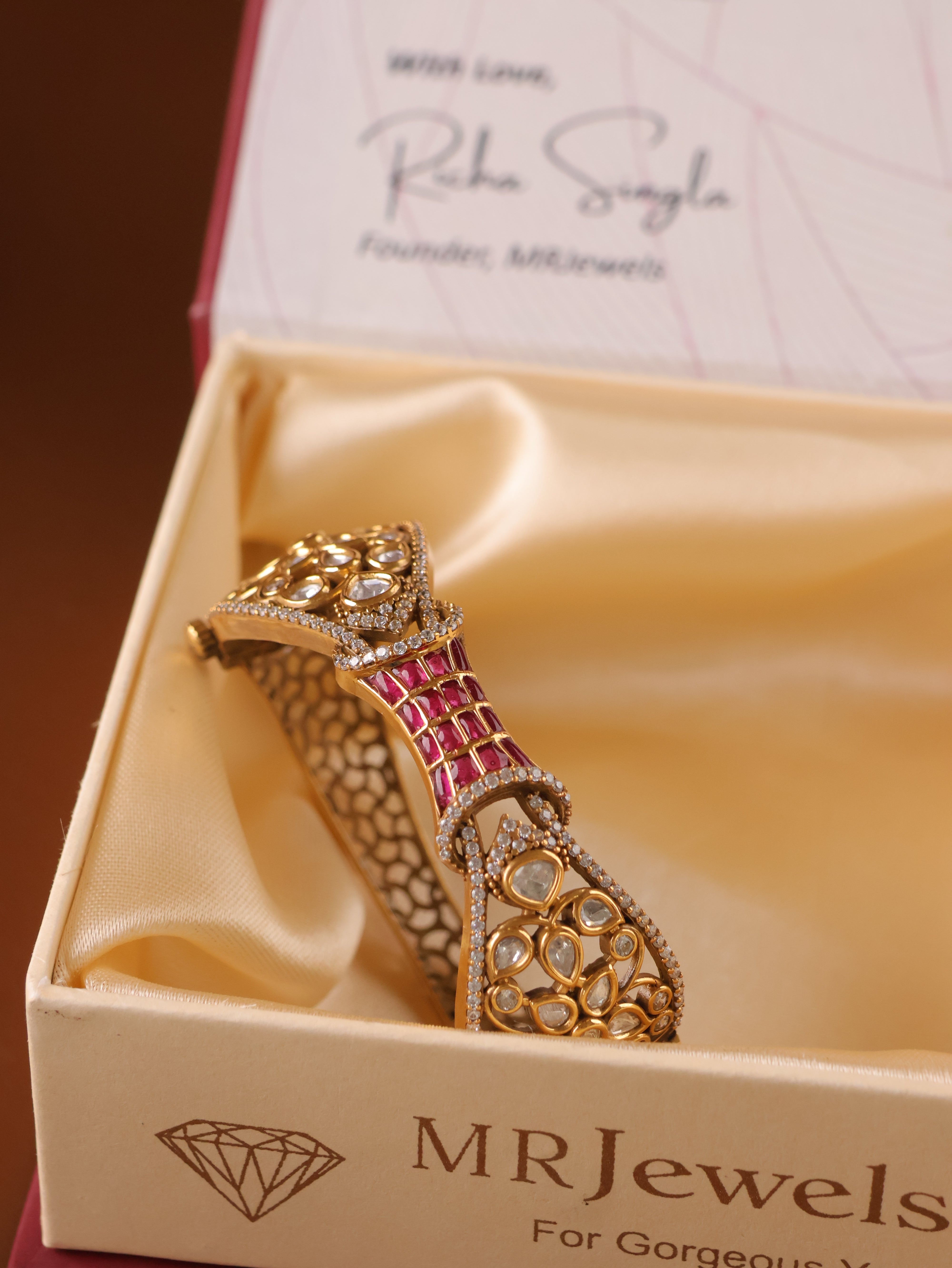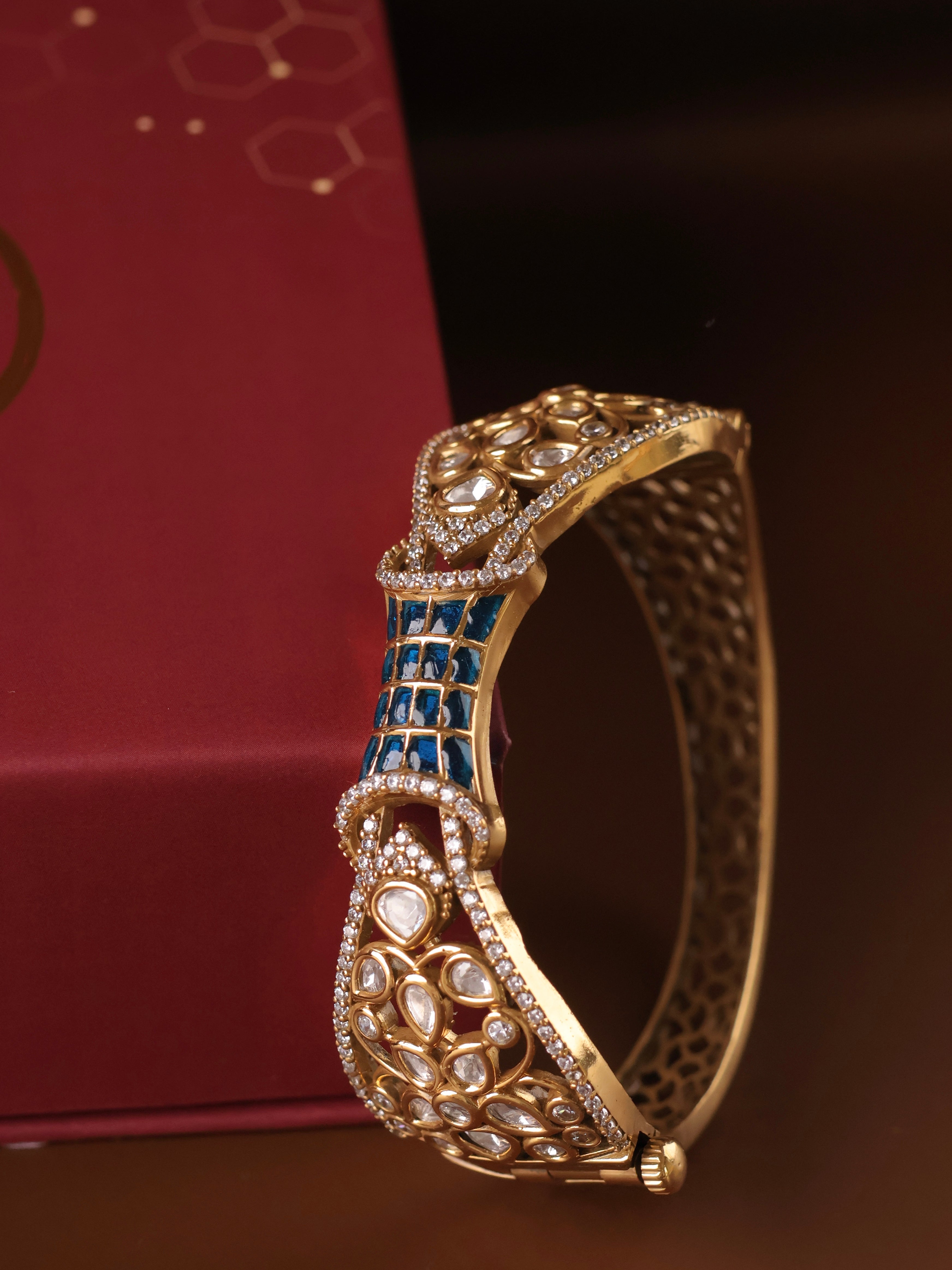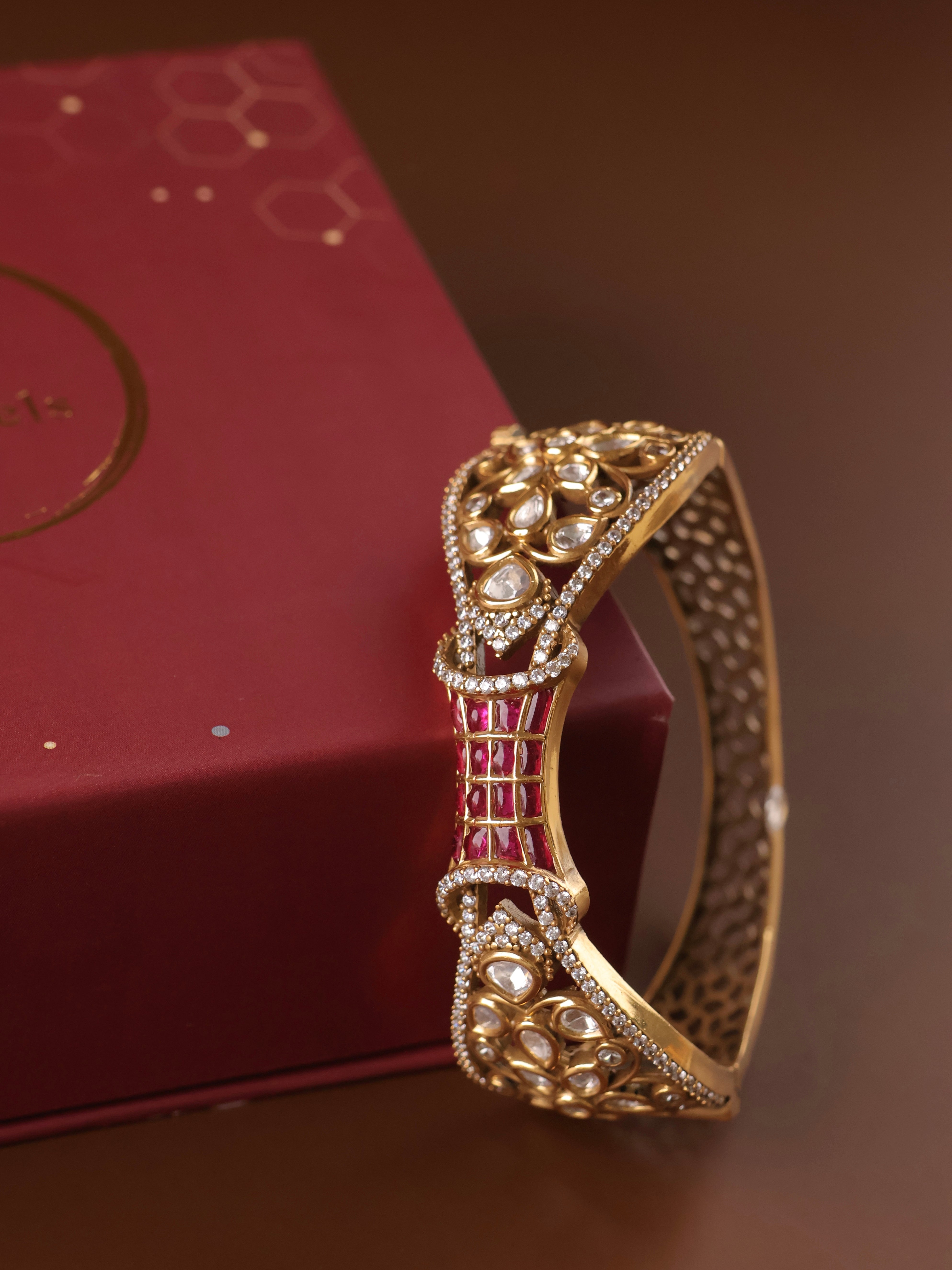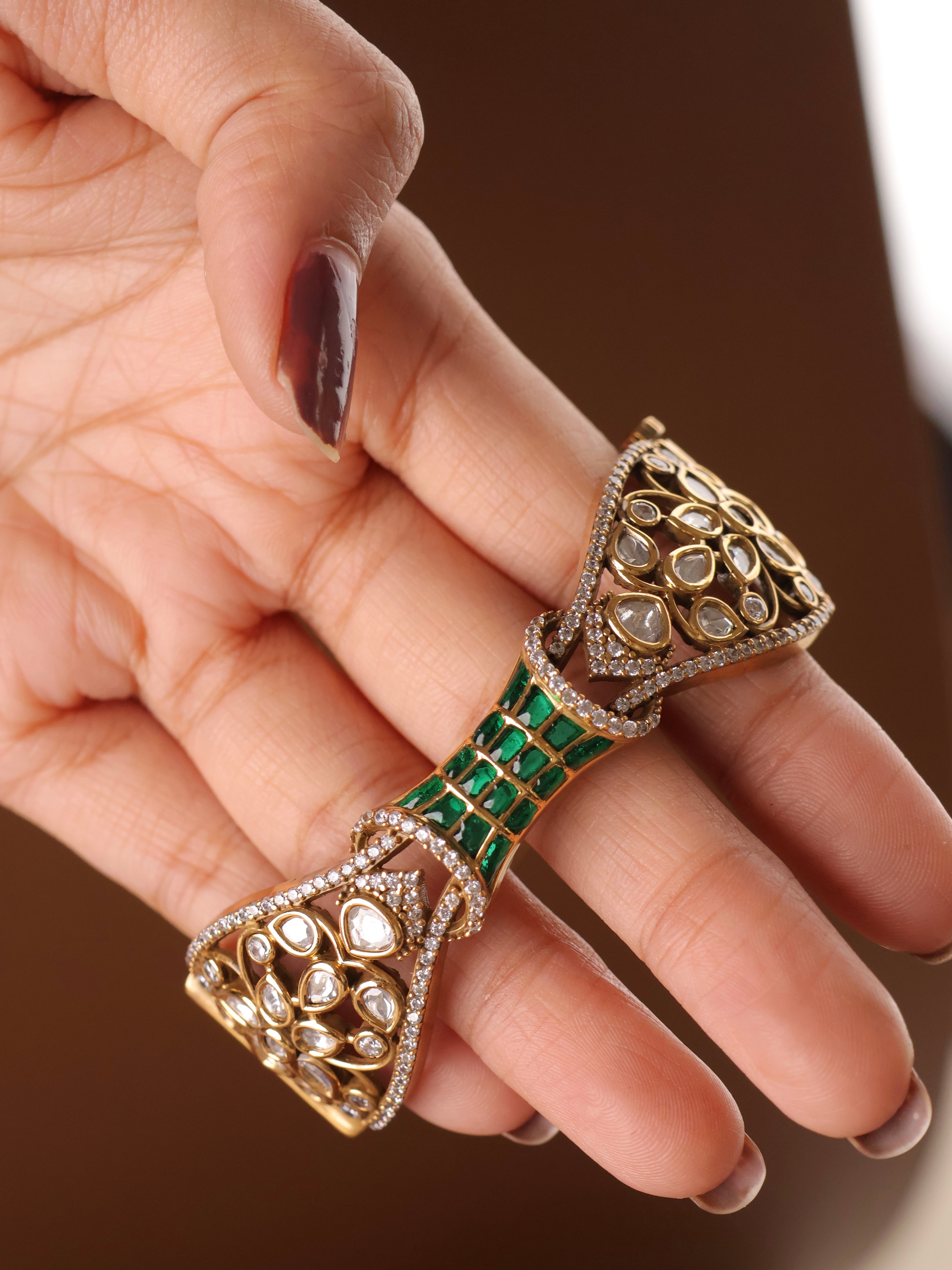 Handcrafted in classic jadau style, the Triad Royale Polki Kada pairs gleaming kundan-polki florets at each end with a gemstone-tiled “bridge” through the centre. Pavé accents, heritage enamel touches and rich micron gold plating create a dramatic hourglass silhouette that sits beautifully on the wrist. Wear it solo for statement glamour or stack it with slim bangles for a modern royal look. Available in Emerald, Sapphire and Ruby tones