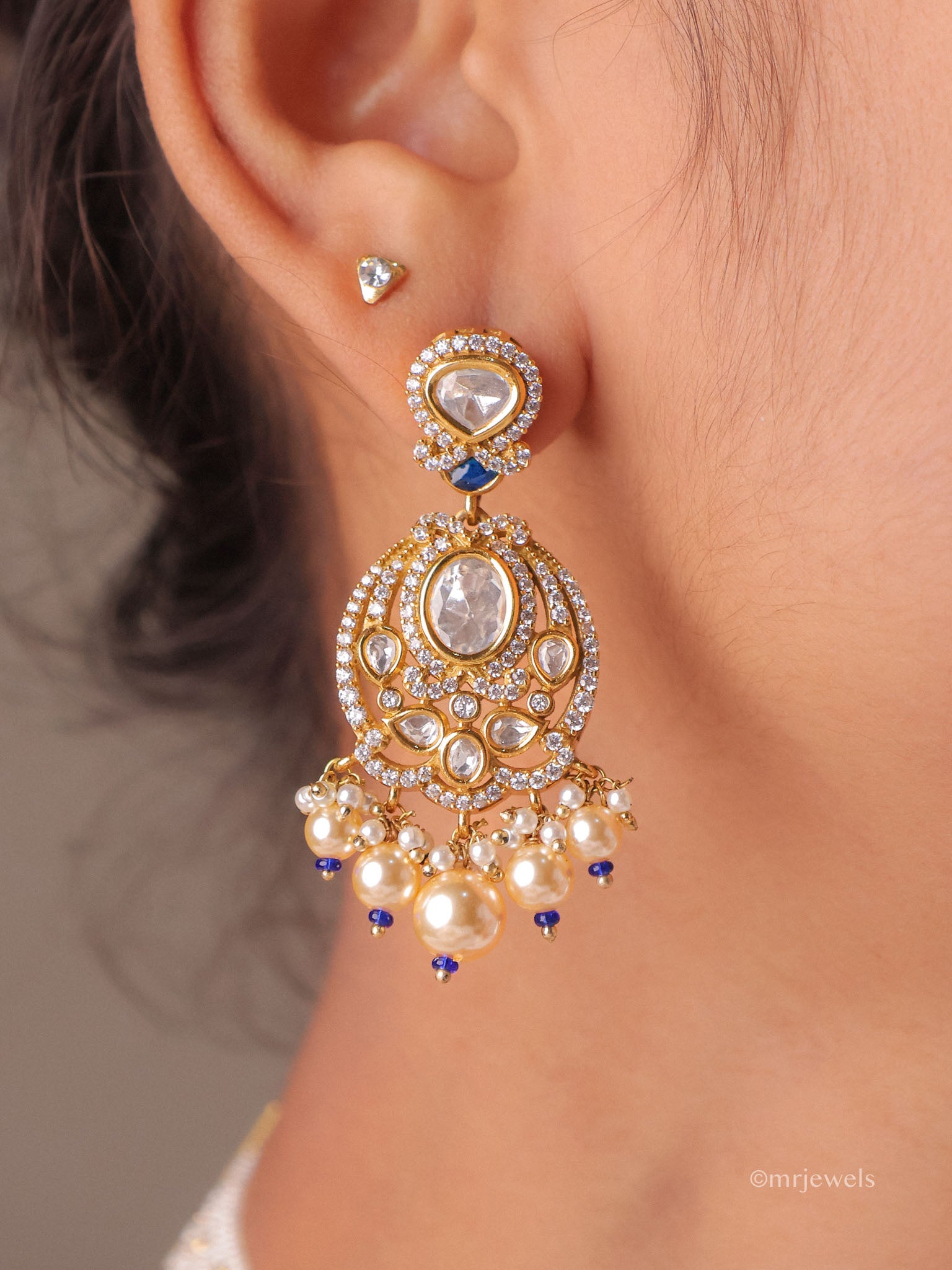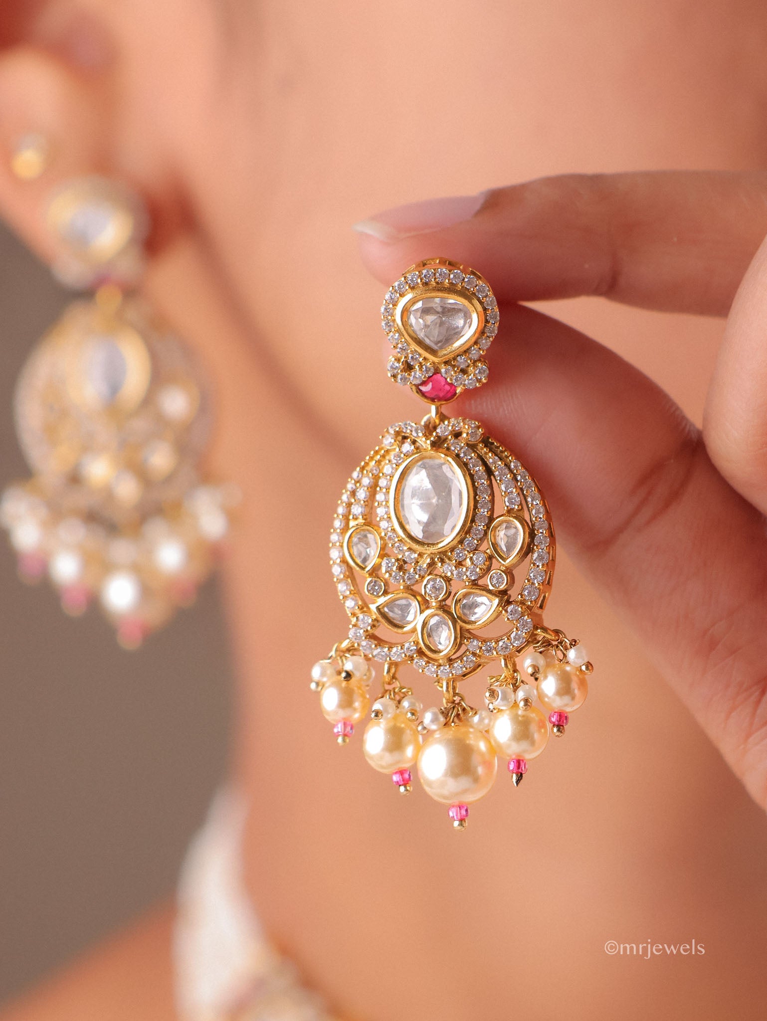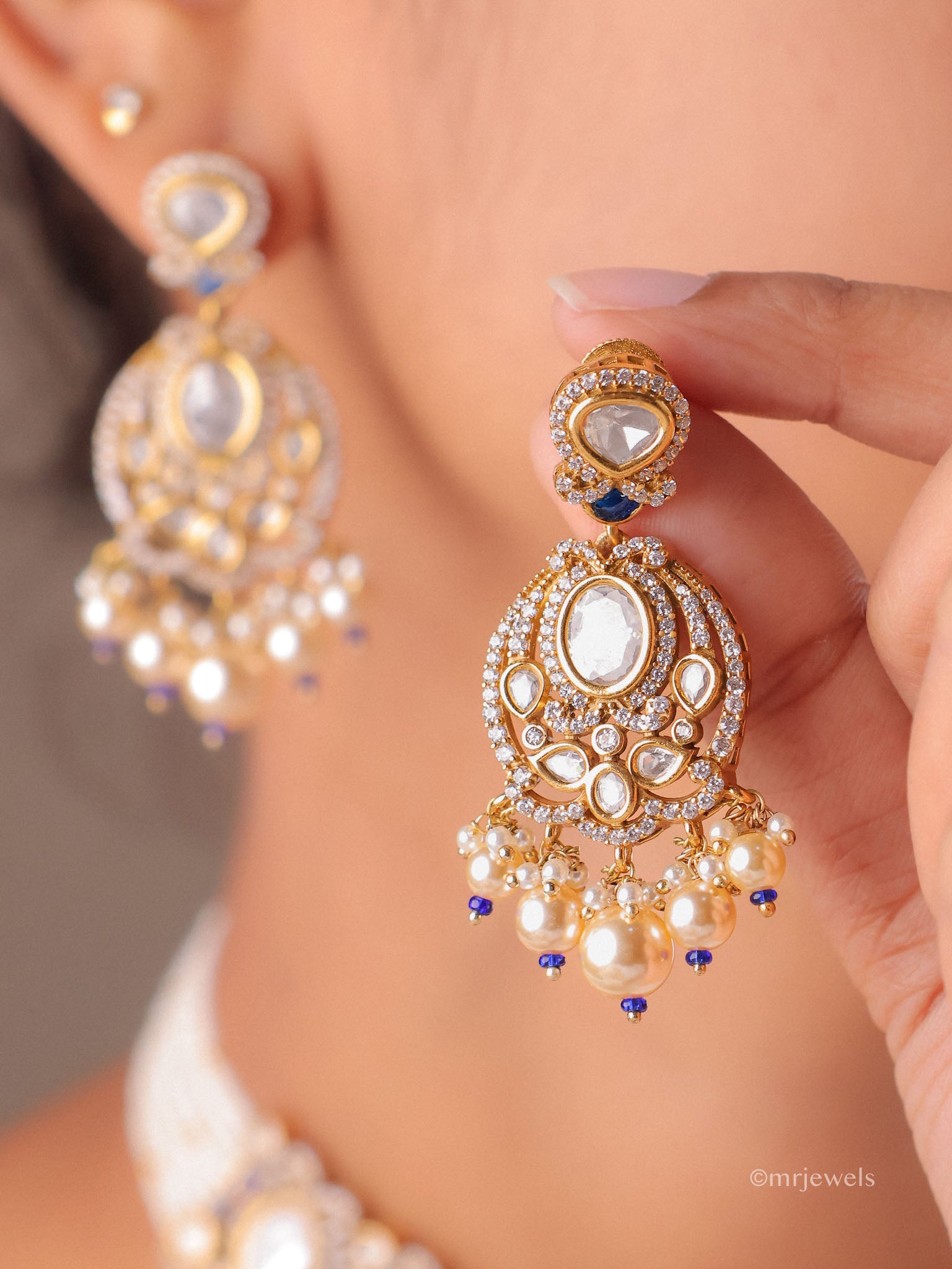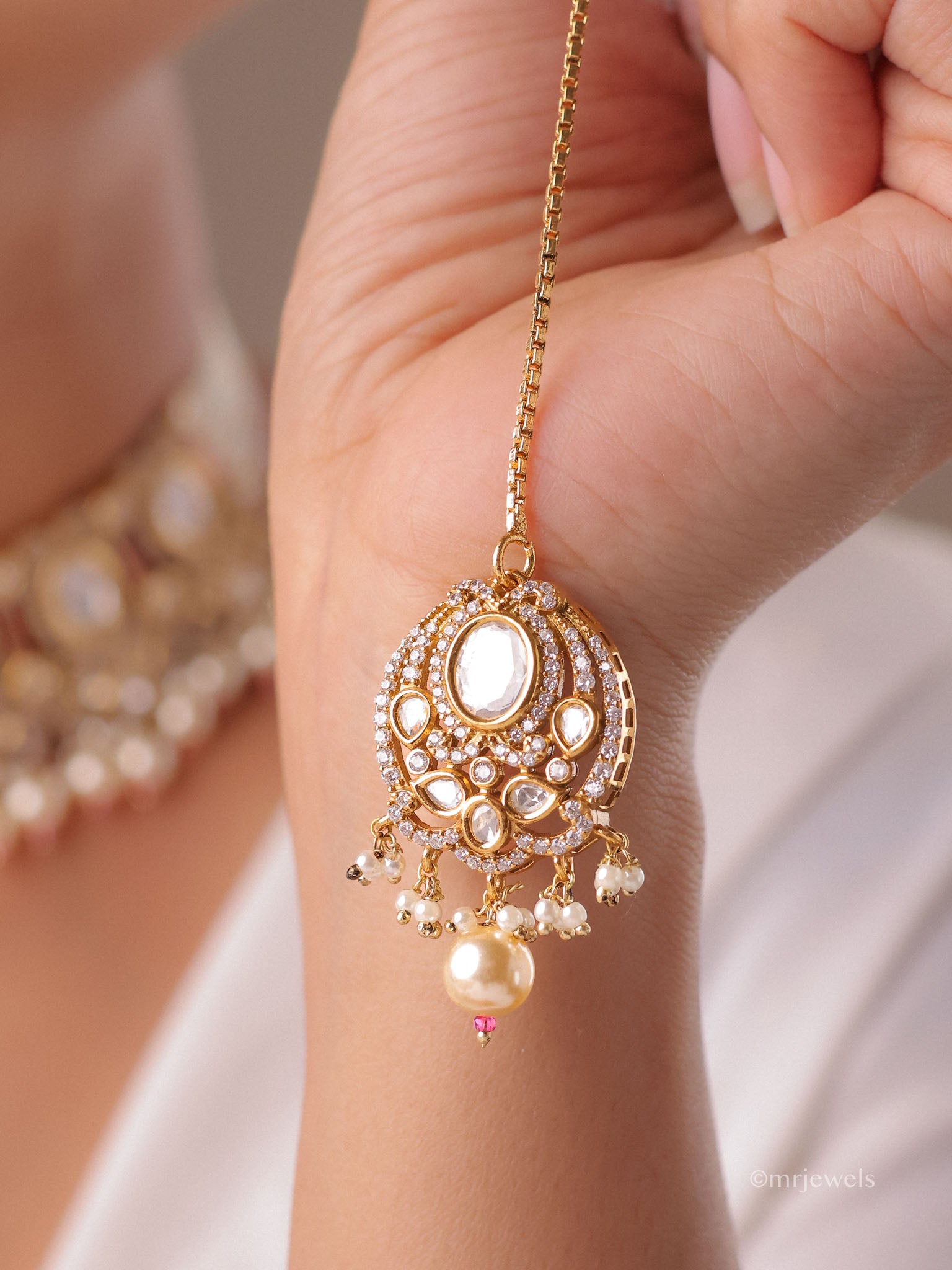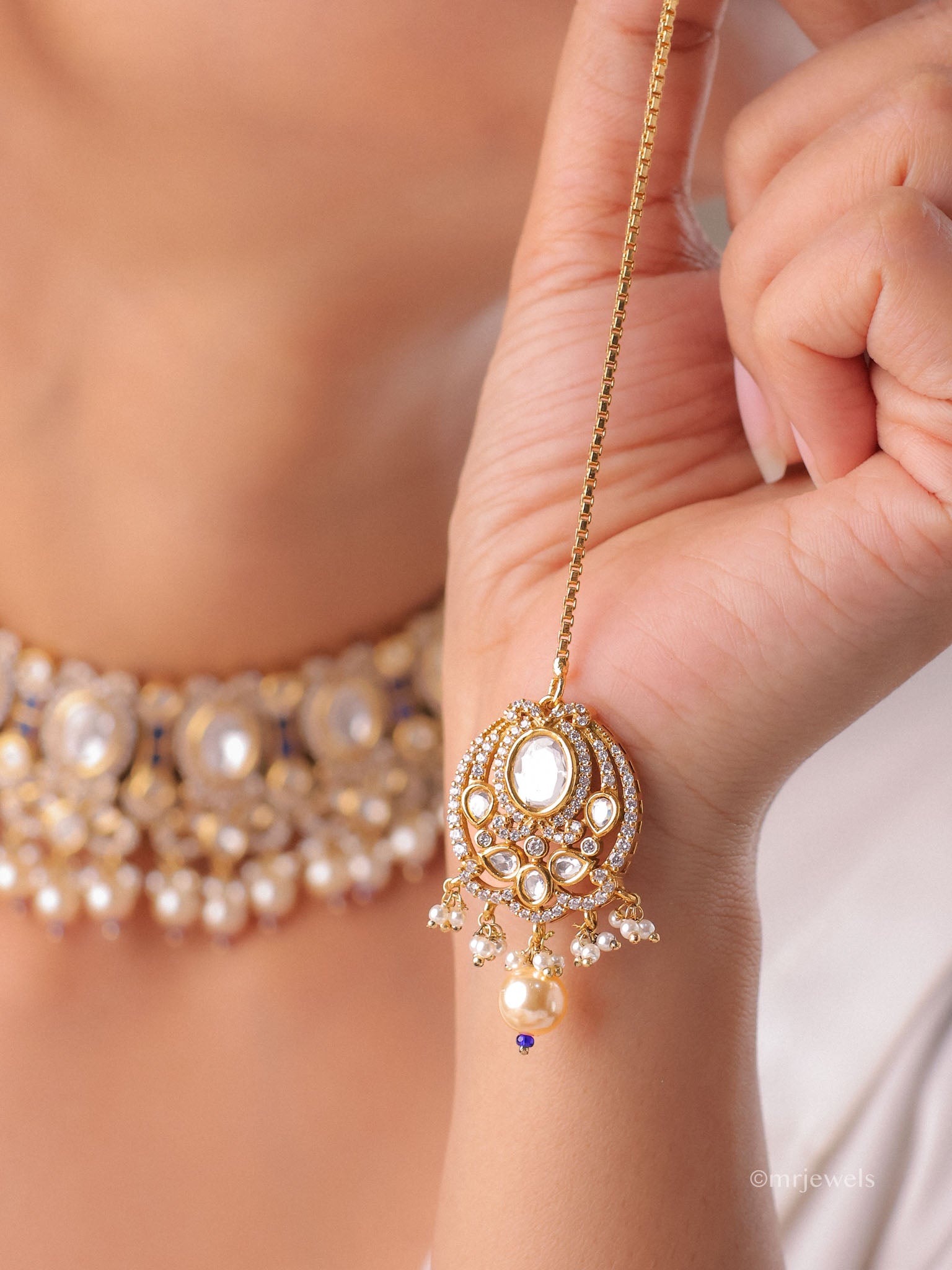 The Ruhani Pearl Bridal Choker Set captures timeless elegance with its intricate kundan-style stones beautifully set in a regal choker silhouette. Accented with delicate pearl drops and subtle colored bead detailing, this exquisite set reflects the charm of traditional bridal jewellery.