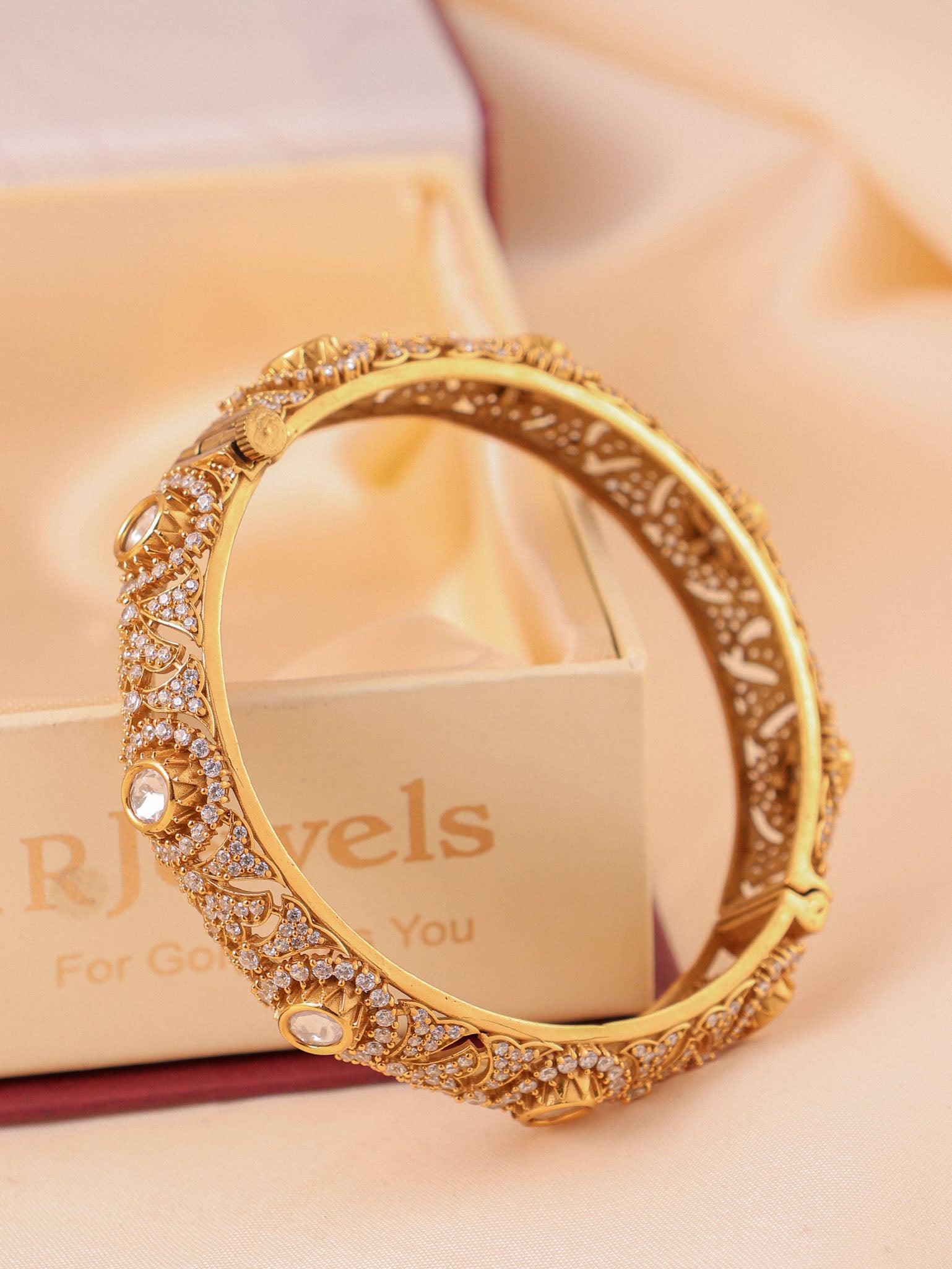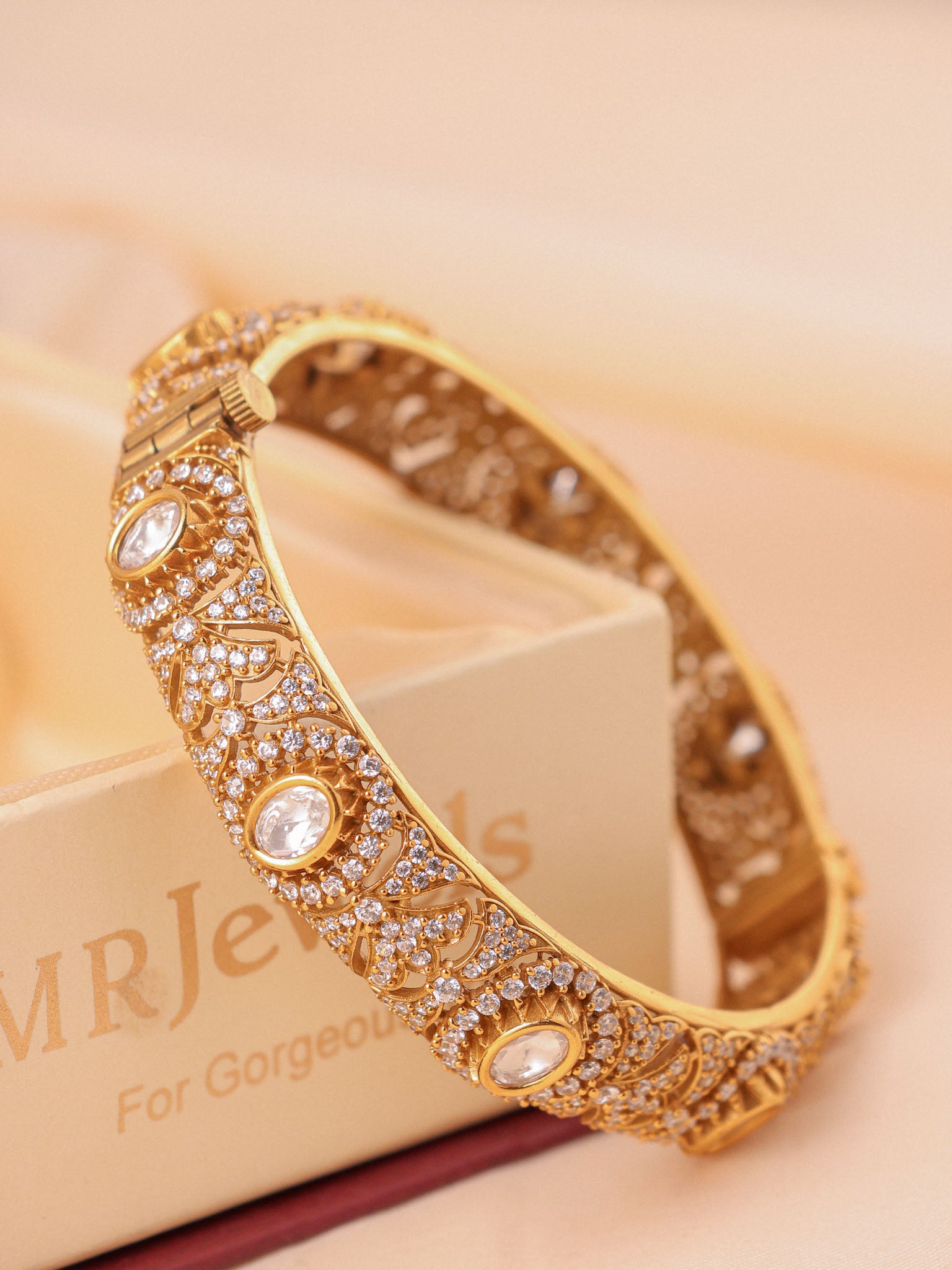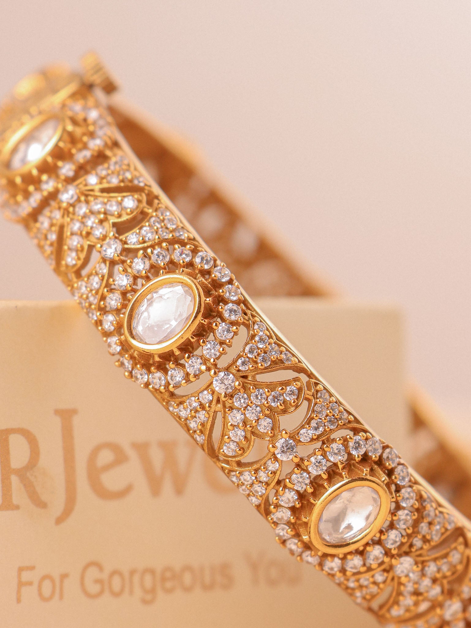 Inspired by the quiet opulence of Indian evenings, the Saanjh Moissanite Kada is a timeless statement of heritage luxury. Handcrafted with intricate floral motifs and encrusted with brilliant moissanite stones, this kada reflects a soft golden glow that feels both regal and refined.
