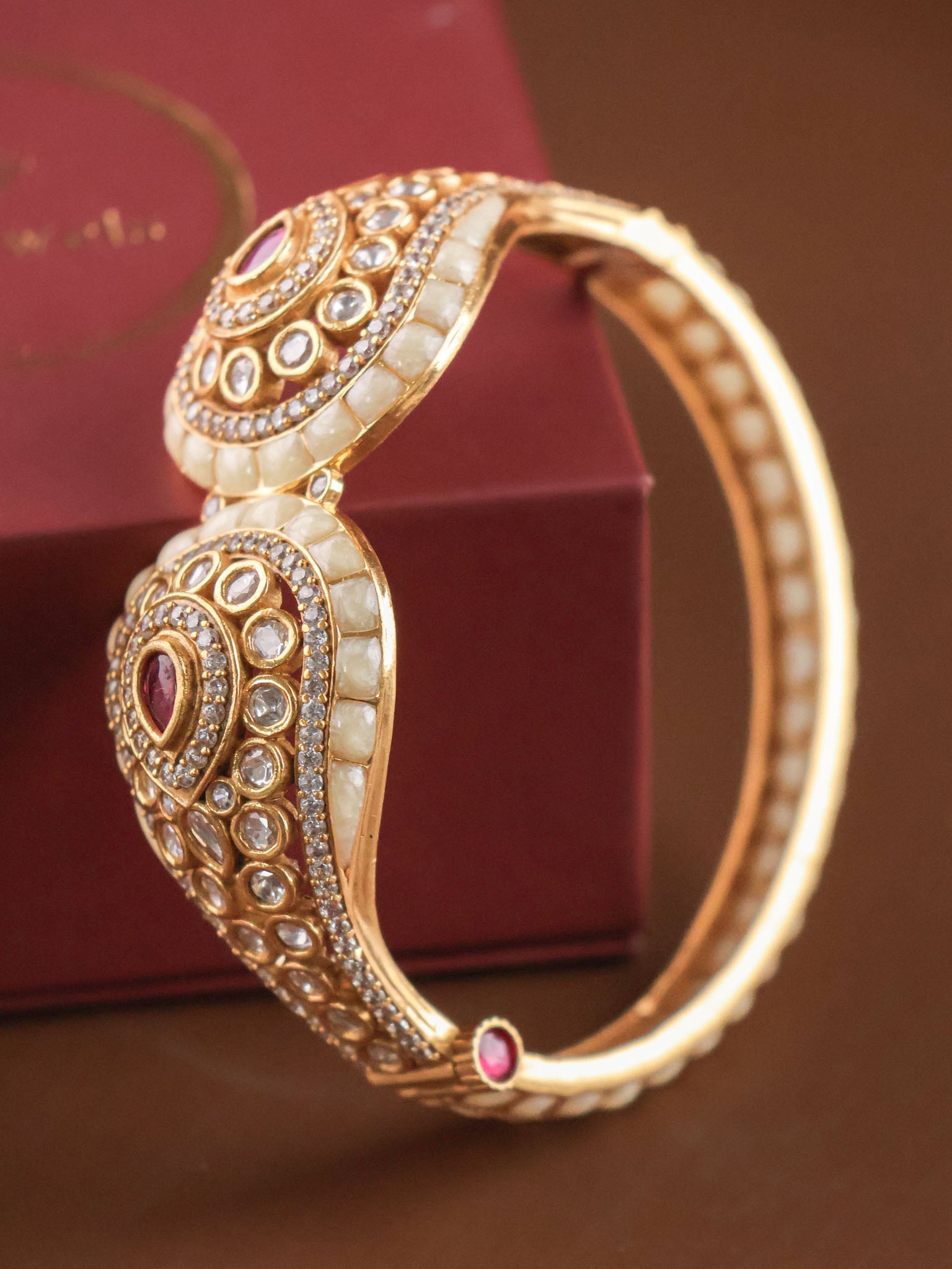 Bold. Elegant. Unforgettable. The Saanvika Statement Kada is a true showstopper, designed for the modern woman who appreciates timeless charm. Adorned with uncut polki-style stones, vibrant emerald or ruby enamel work, and finished in rich micron gold plating — this openable kada strikes the perfect balance between tradition and contemporary luxury. Its artistic teardrop silhouette and intricate craftsmanship make it an ideal accessory for weddings, festive occasions, or grand celebrations. Available in two striking colourways to match your mood and outfit.