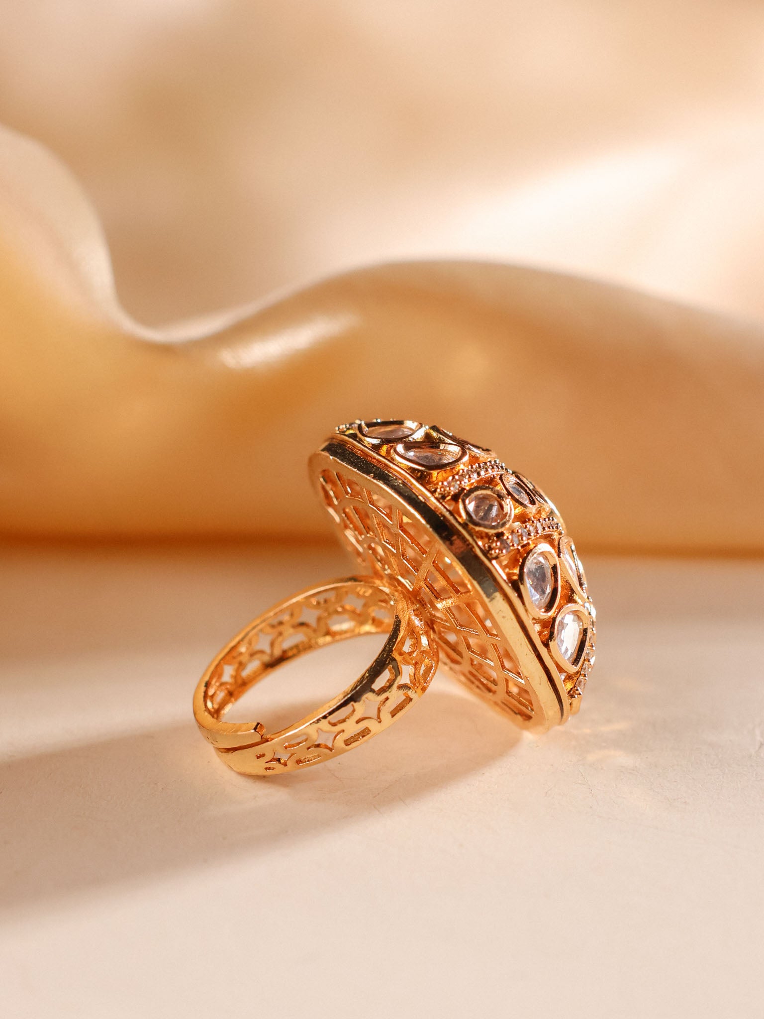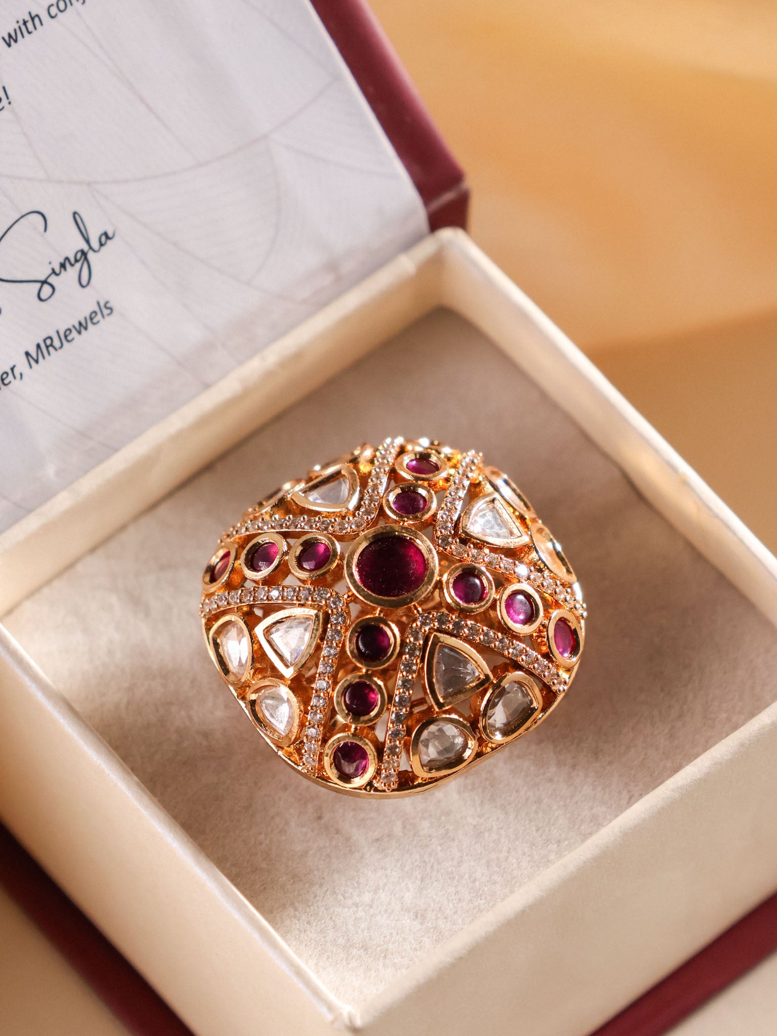 Bold, intricate, and timeless, the Zeenat Riwaayat Polki Statement Ring is inspired by classic Indian jaali craftsmanship. Featuring a beautifully structured dome silhouette, this ring is adorned with polki-style stones and rich coloured accents set in a warm gold-toned finish.